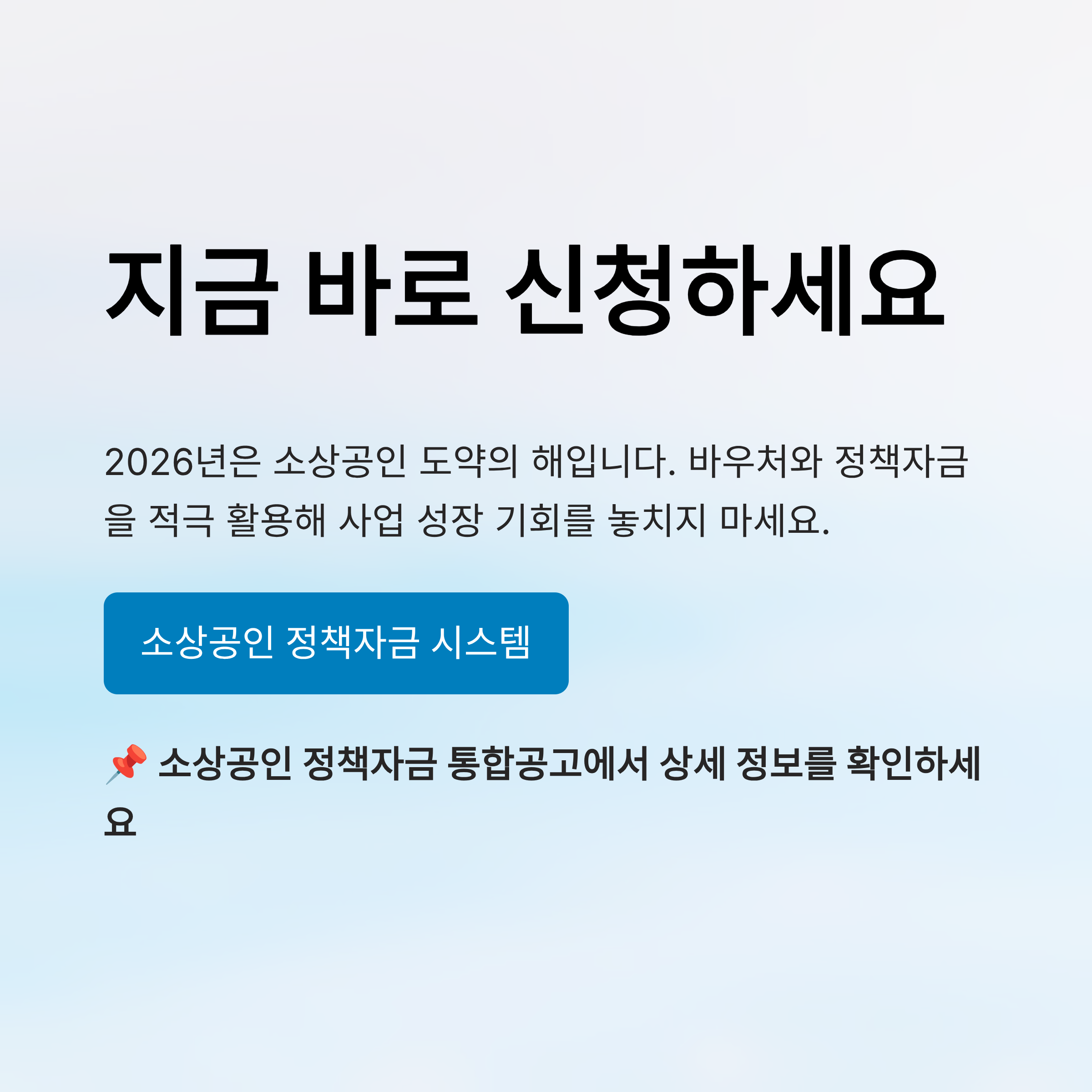 2026년은 소상공인에게 있어 도약의 해가 될 수 있습니다. 바우처와 정책자금을 적극 활용해 사업을 안정적으로 운영하고 성장 기회를 놓치지 마세요.