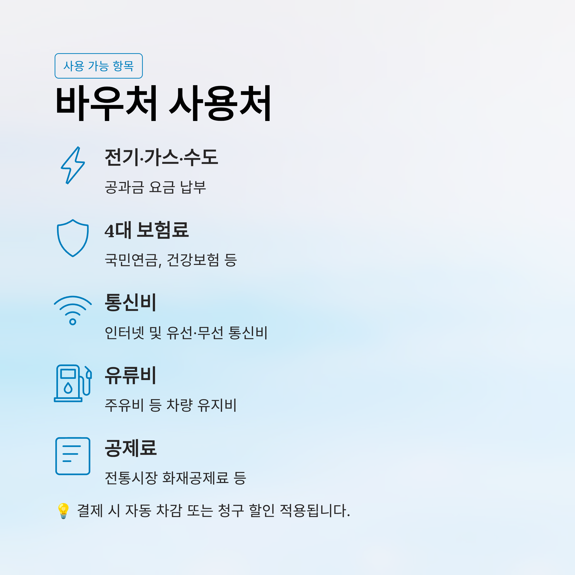 - 사용처: 전기요금, 4대 보험료, 통신비, 유류비 등 고정비 부담 항목