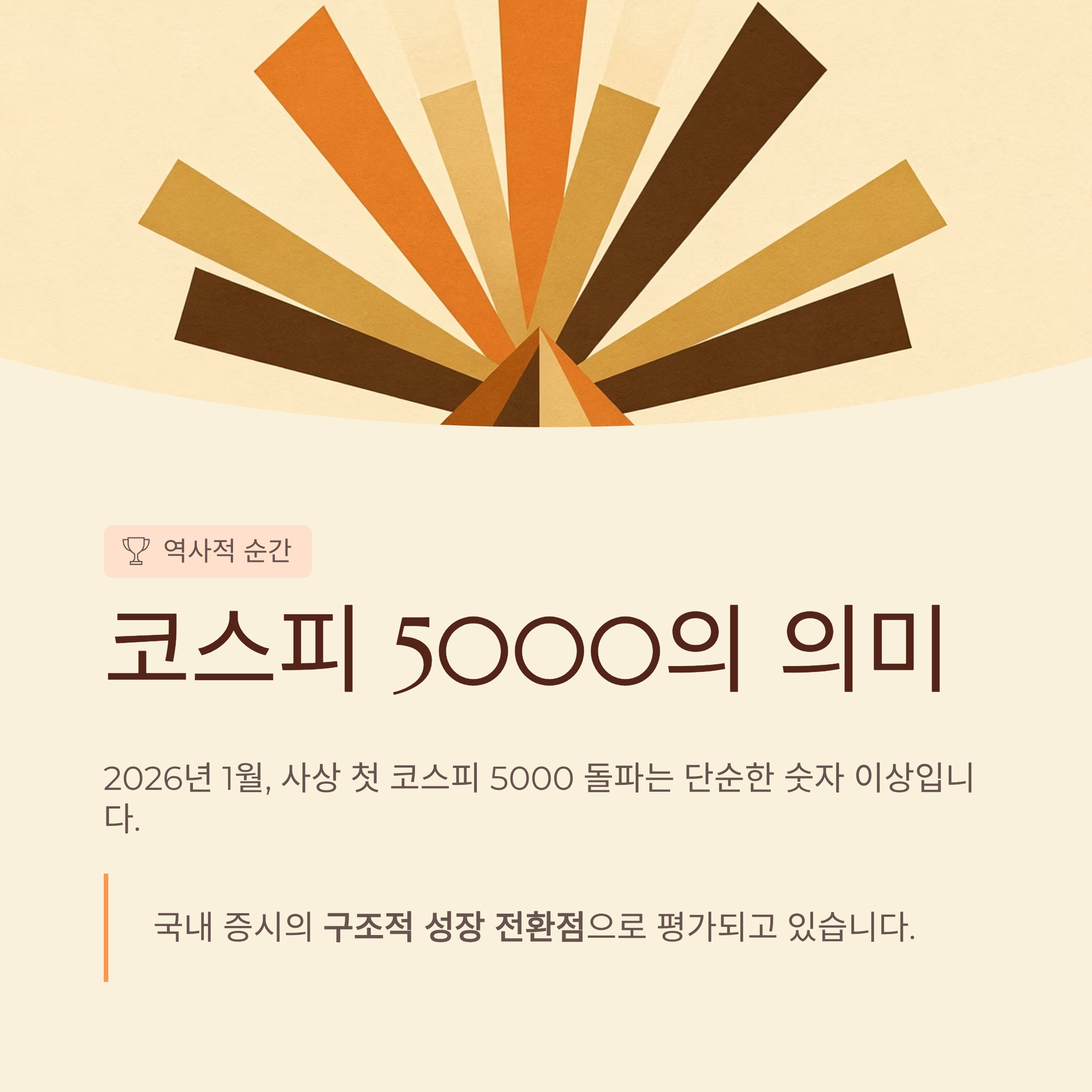 2026년 1월, 사상 첫 코스피 5000 돌파는 단순한 숫자 이상입니다. 국내 증시의 구조적 성장 전환점으로 평가되고 있습니다.