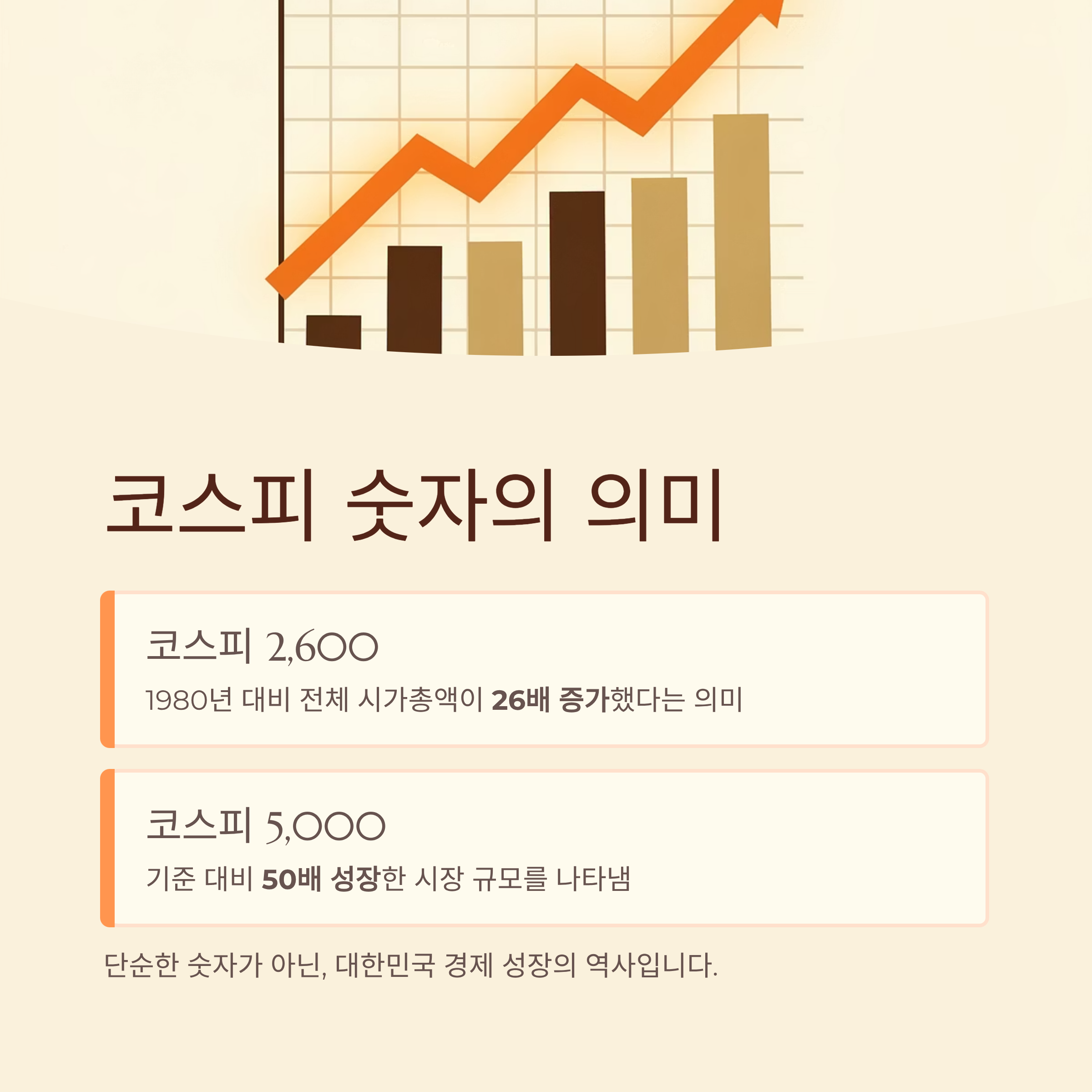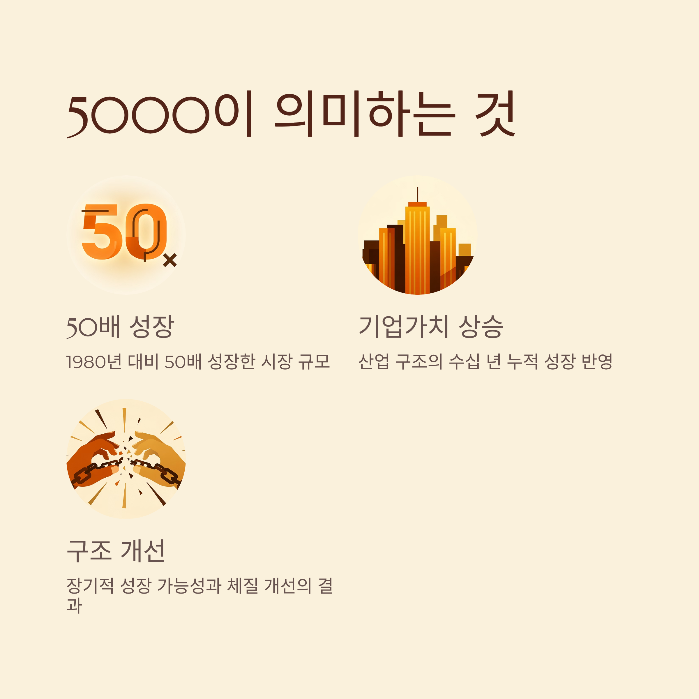 - 코스피 5,000 = 기준 대비 50배 성장한 시장 규모