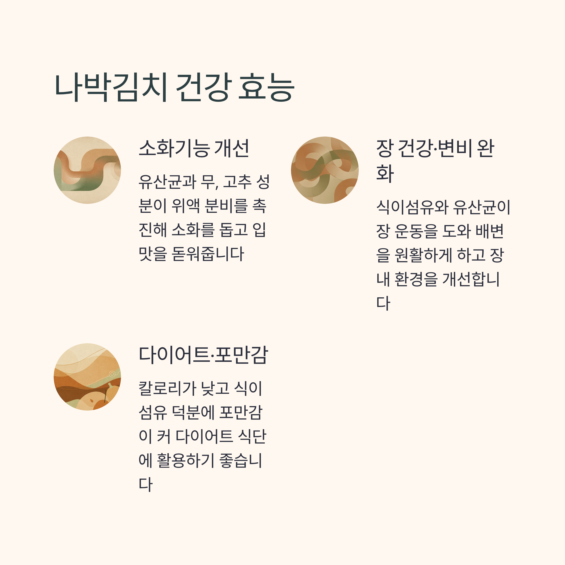 나박김치는 배추, 무, 고추, 마늘 등이 들어가 발효되며 다양한 건강 효과가 있는 것으로 알려져 있습니다.