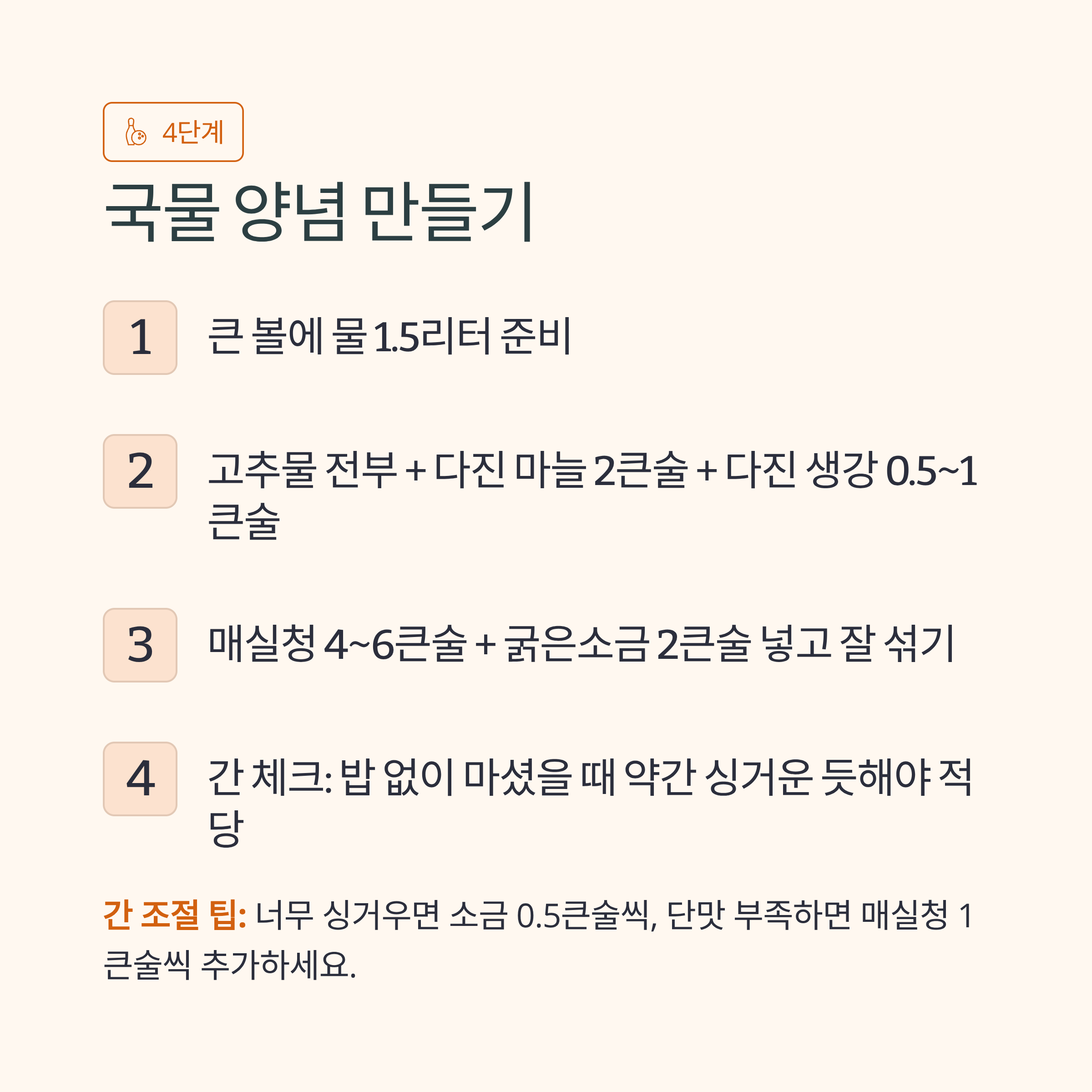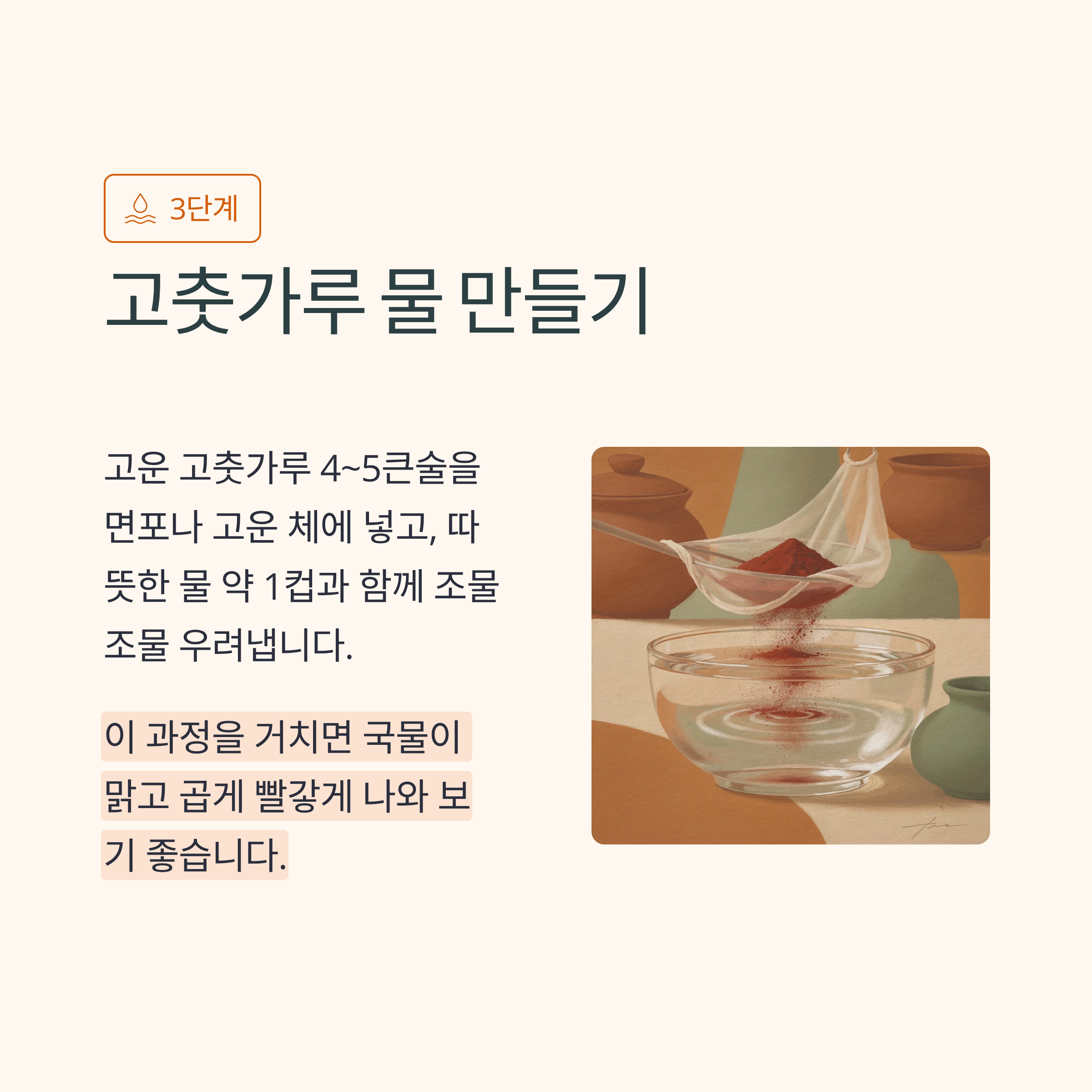 국물만 따로 보면 “물 : 고춧가루 : 소금 : 단맛”을 비율로 잡으면
