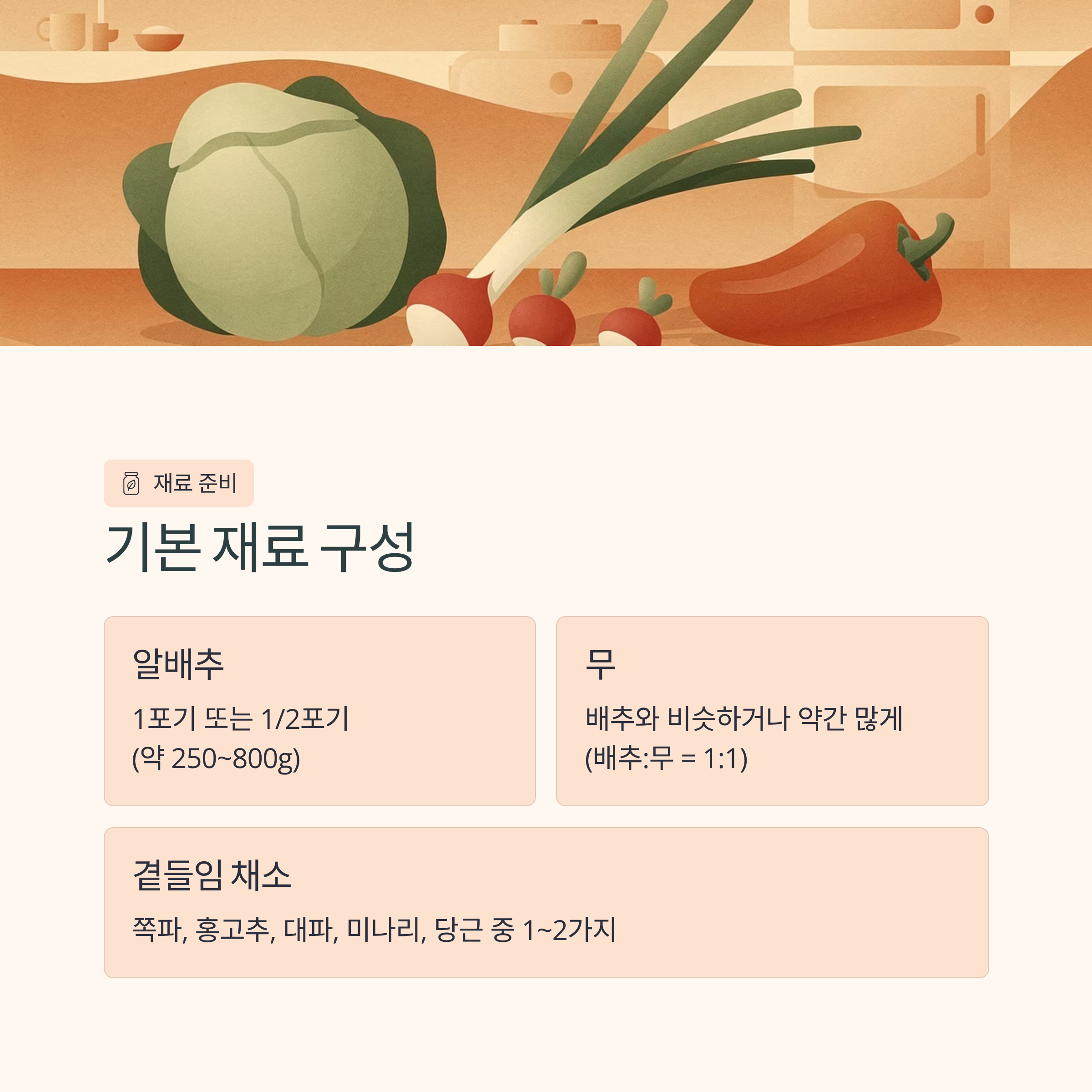 여기서는 “알배추 1/2통 + 무 1/2개, 물 1.5L 기준” 쉬운 버전으로 정리합니다.