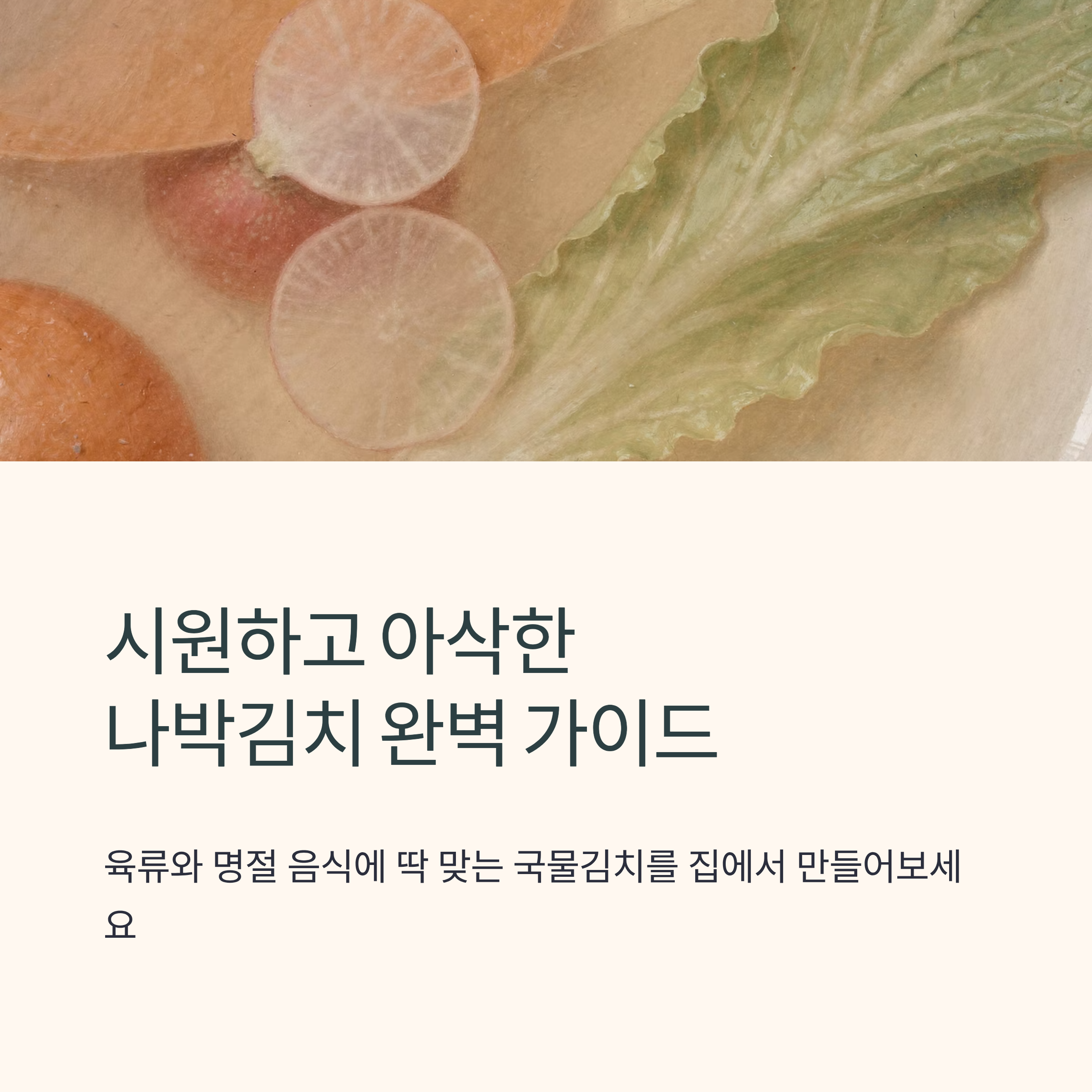 나박김치는 무·배추의 시원한 단맛과 아삭한 식감이 살아있는 국물김치라, 육류나 명절 음식과 특히 잘 어울립니다.