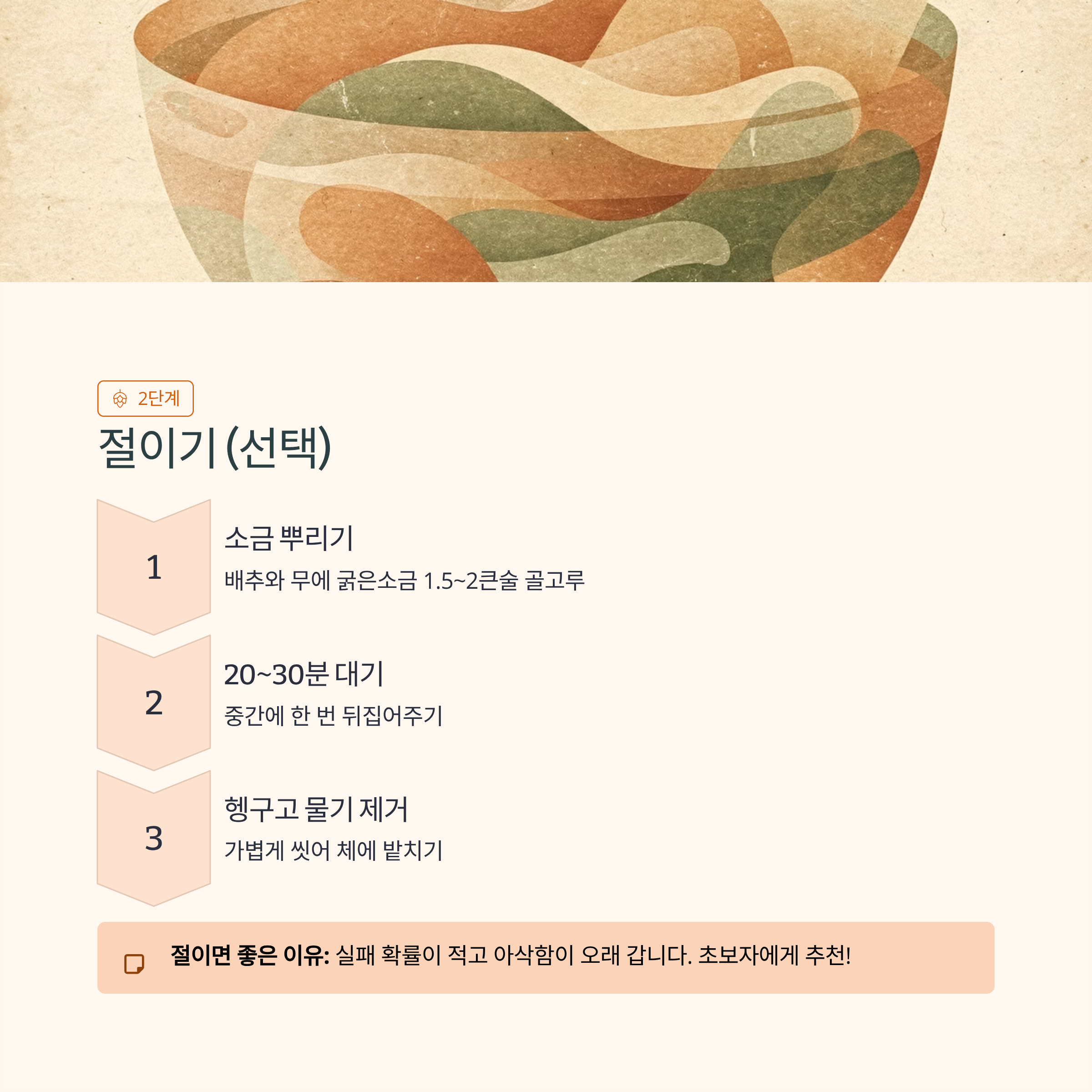 - 절이는 레시피: 배추·무를 굵은소금으로 20~30분 절여 사용.
