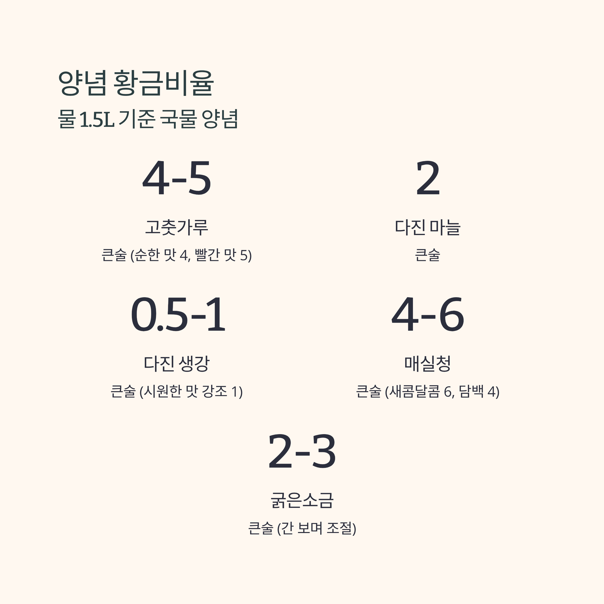 - 다진 마늘·생강은 과하지 않게: 너무 많이 넣으면 알싸함이 강해져 국물을 마시기 부담스러울 수 있습니다.