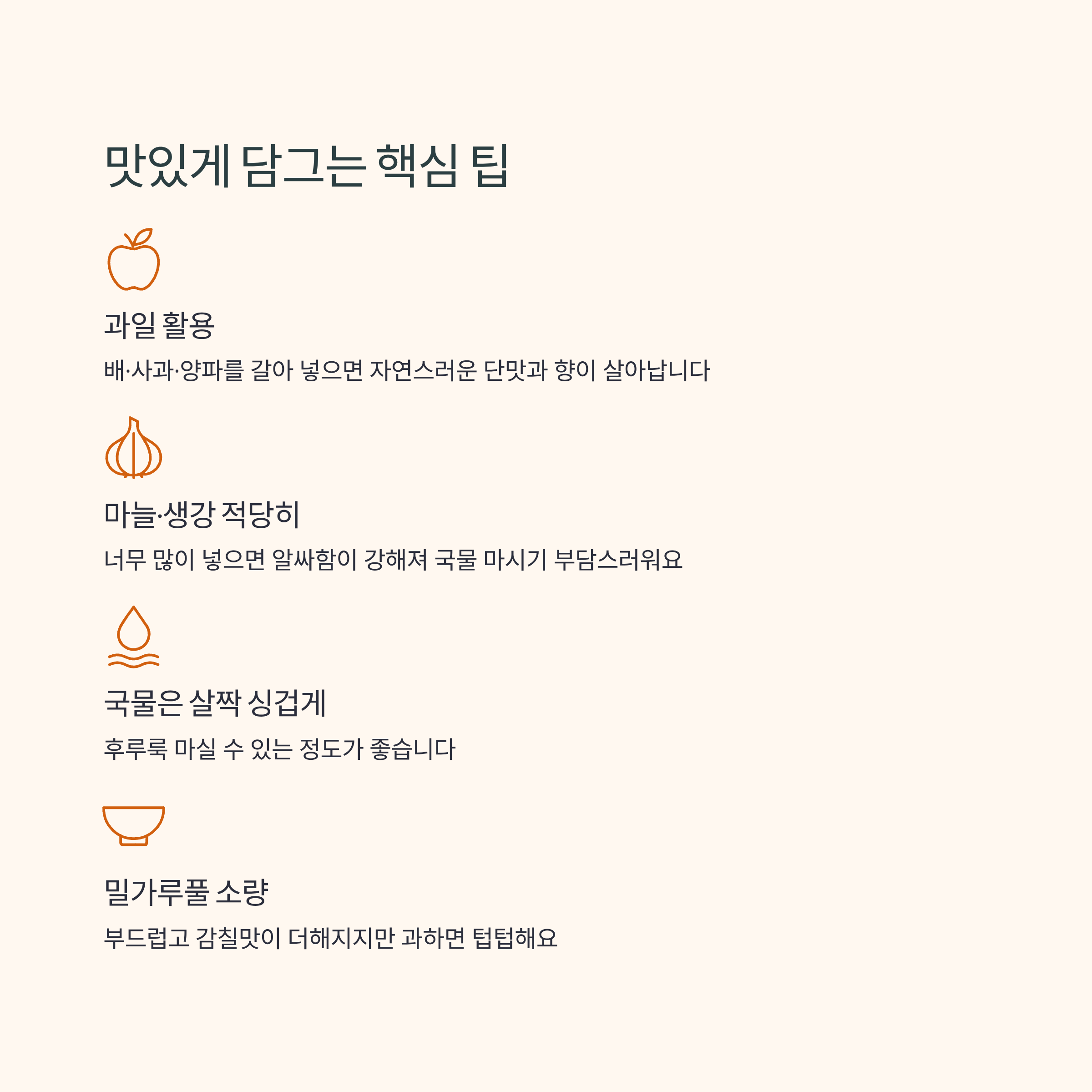 - 배·사과·양파 활용: 과일과 양파를 갈아 넣거나 즙만 우려 쓰면 자연스러운 단맛과 향이 살아납니다.