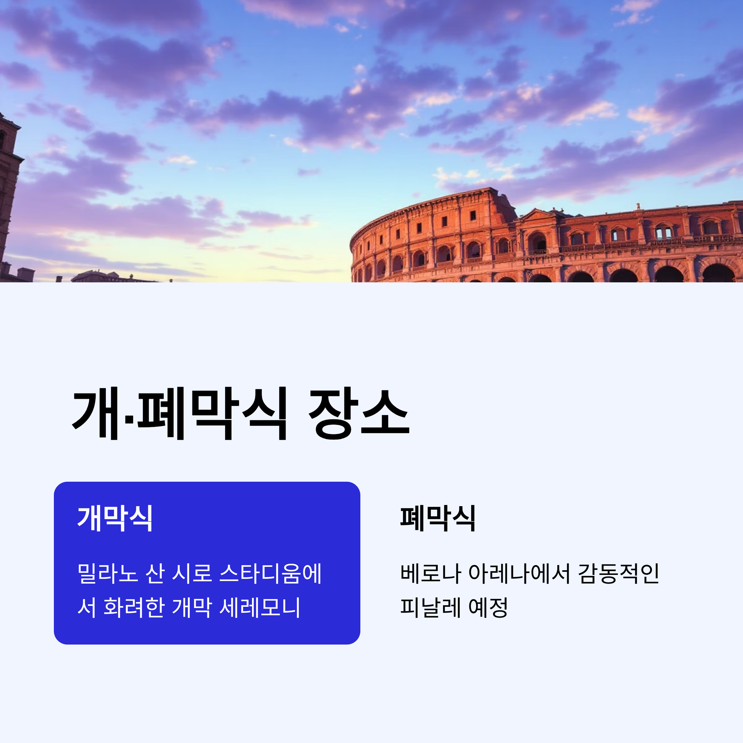 - 개최지: 이탈리아 밀라노, 코르티나 담페초 등 4개 권역 분산 개최