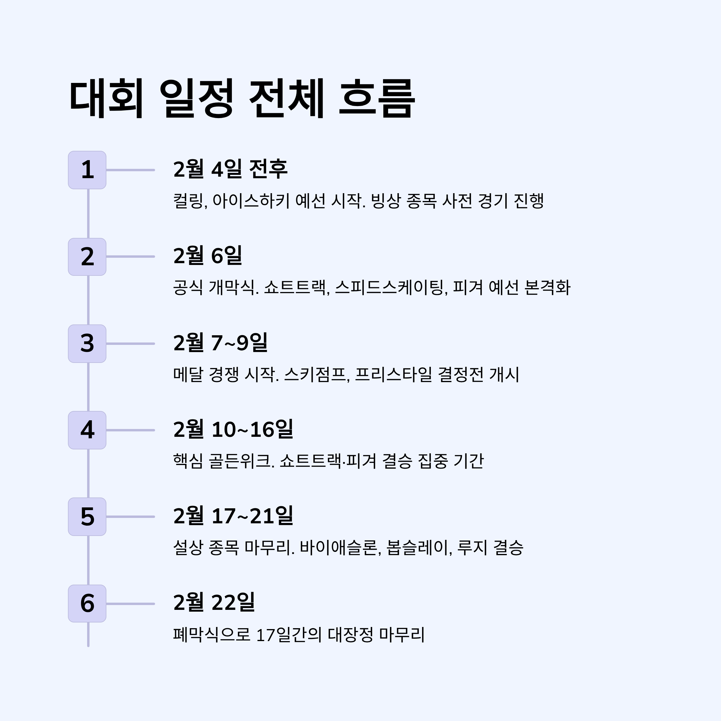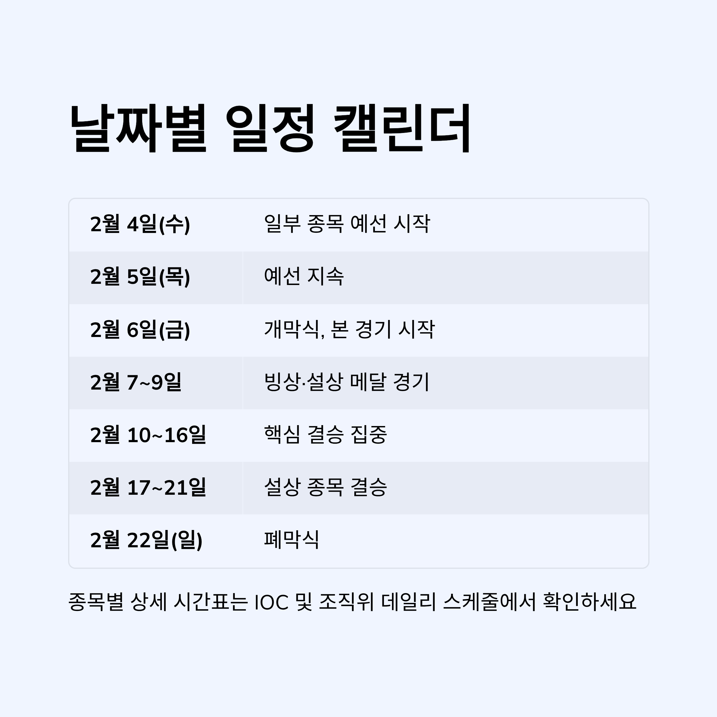 👉 종목별 상세 시간표는 IOC 및 조직위 데일리 스케줄 참고