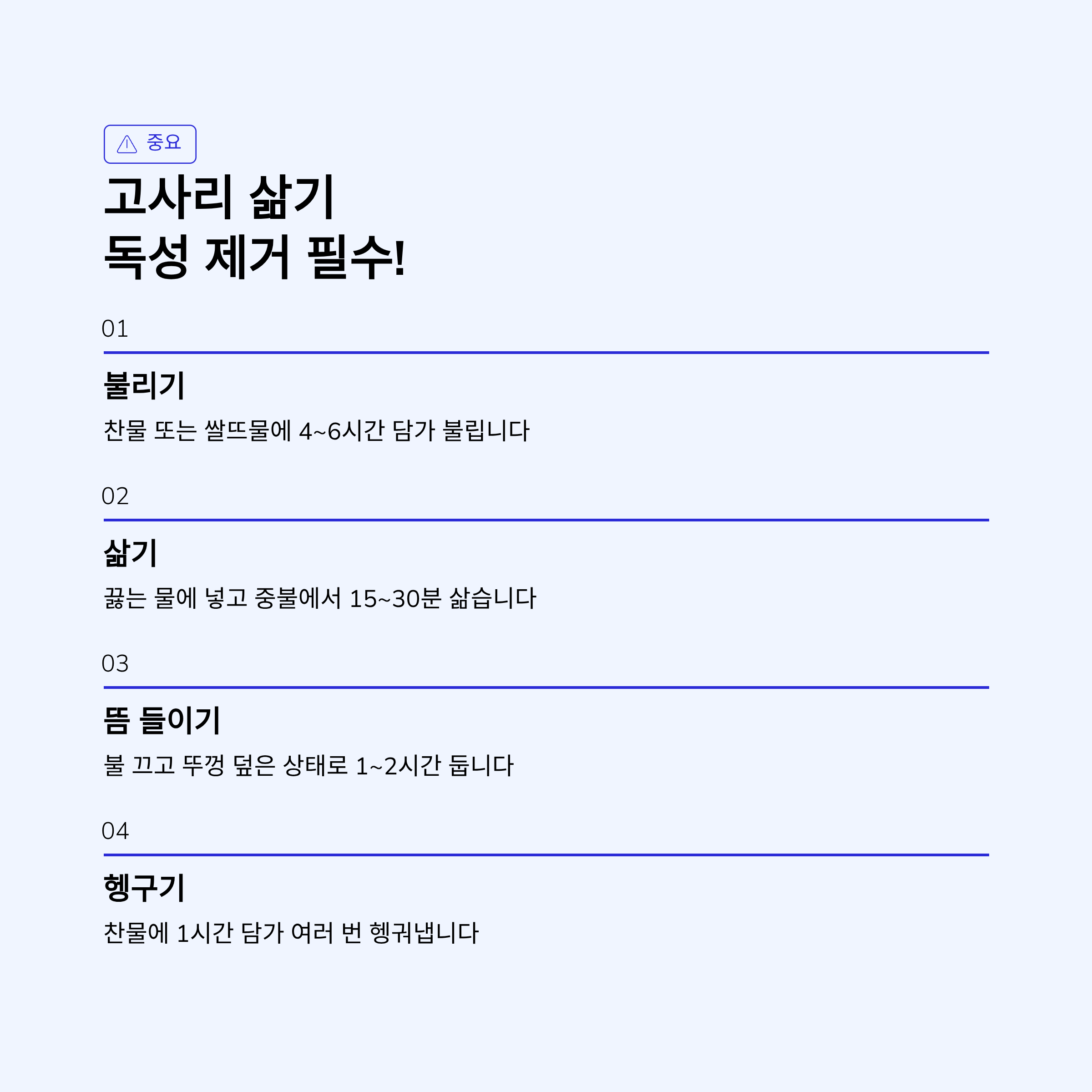 - 찬물에 1시간 담가 여러 번 헹굽니다.