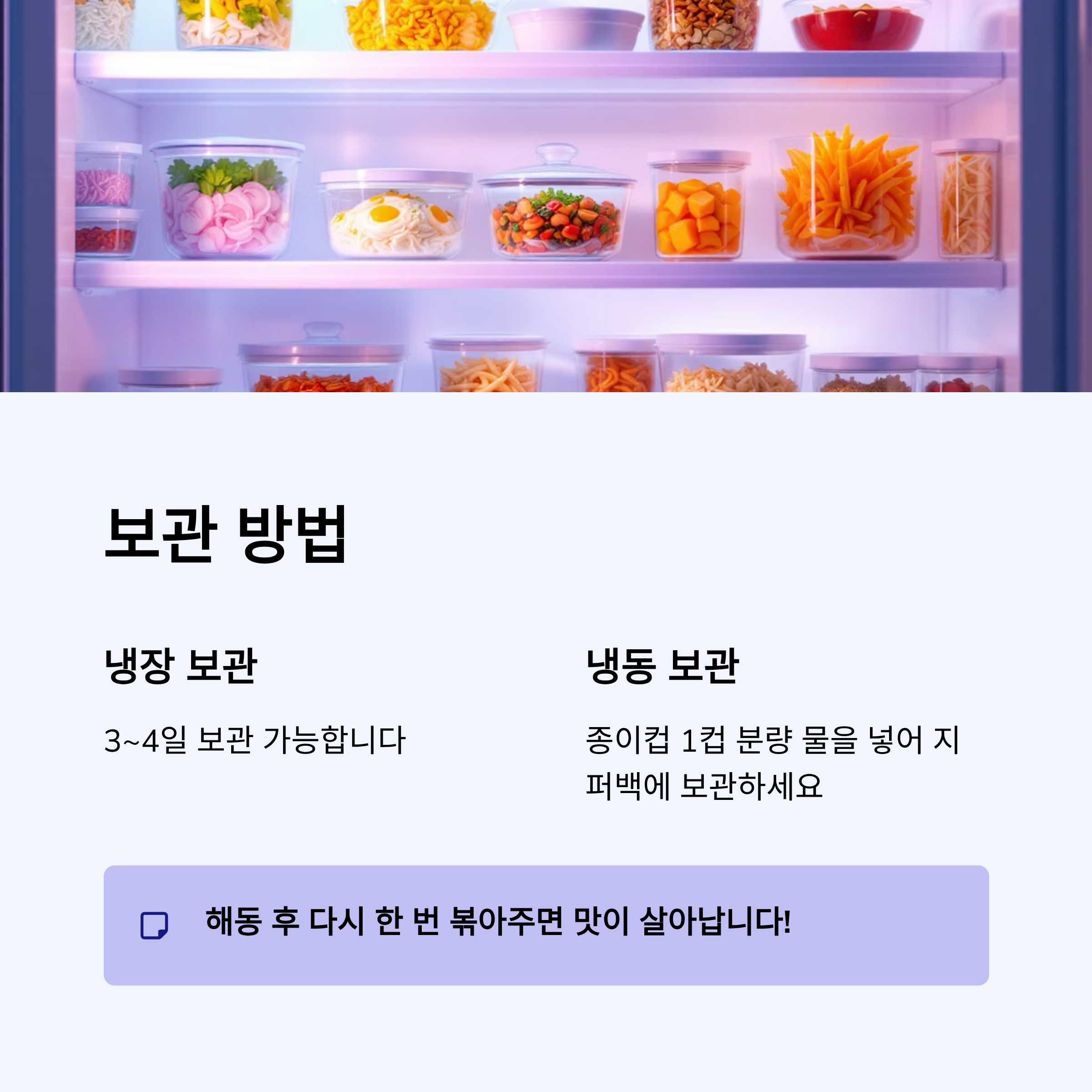 - 해동 후 다시 한 번 볶아주면 맛이 살아납니다.