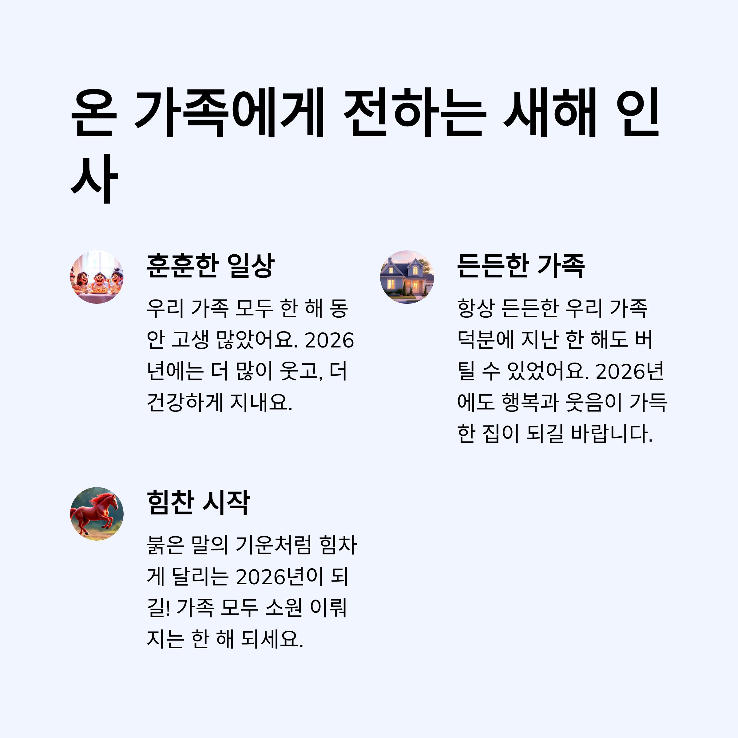 - 우리 가족 모두 한 해 동안 고생 많았어요. 2026년에는 더 많이 웃고, 더 건강하게 지내요. 새해에도 서로에게 힘이 되는 한 해 되길!