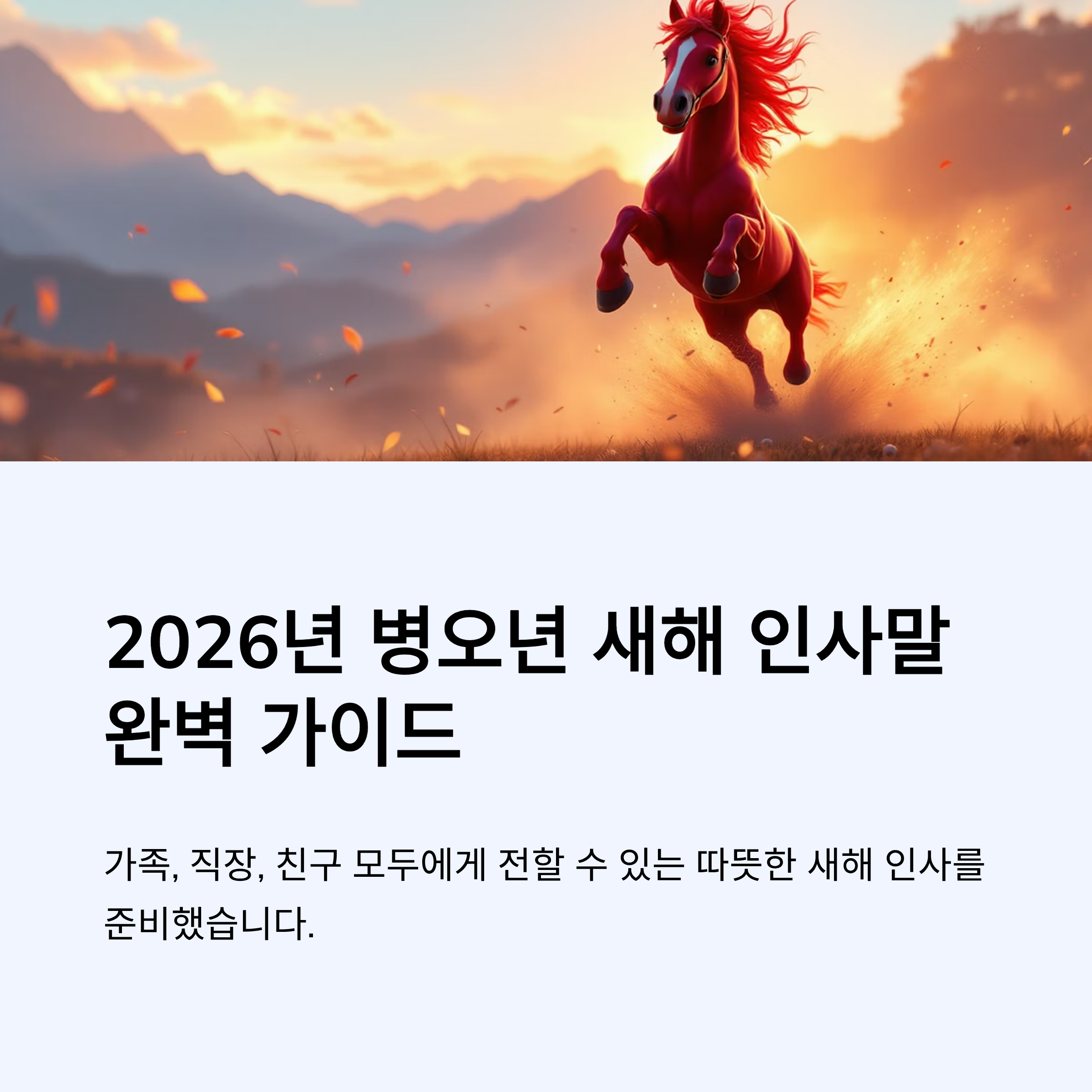 2026년 병오년(붉은 말의 해) 새해 인사말은 “건강·감사·응원” 3가지만 잡으면 가족·직장·친구 모두 응용해서 쓰기 좋습니다.