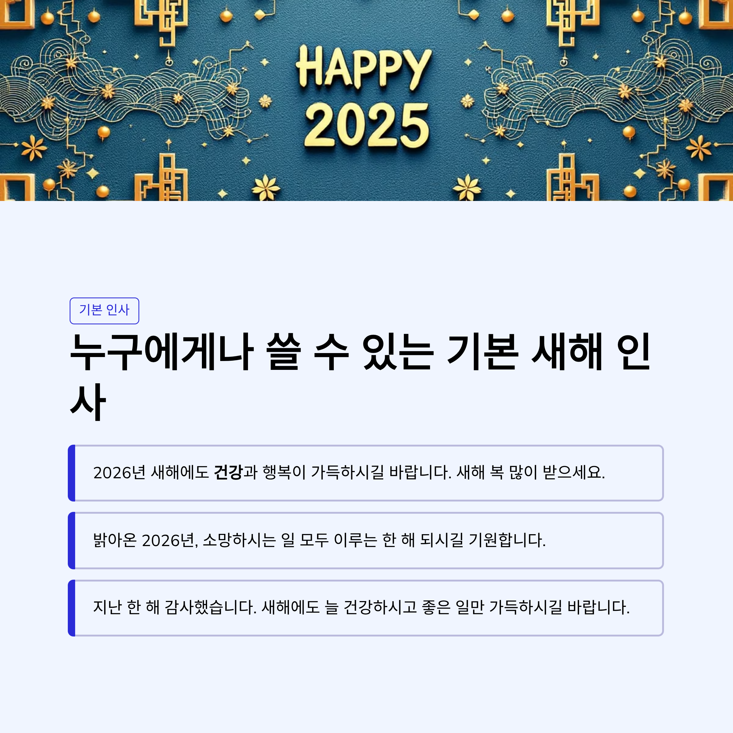 - 새해 복 많이 받으십시오. 2026년에도 변함없는 지도와 격려 부탁드리며, 하시는 모든 일에 좋은 결실이 함께하시길 기원합니다.