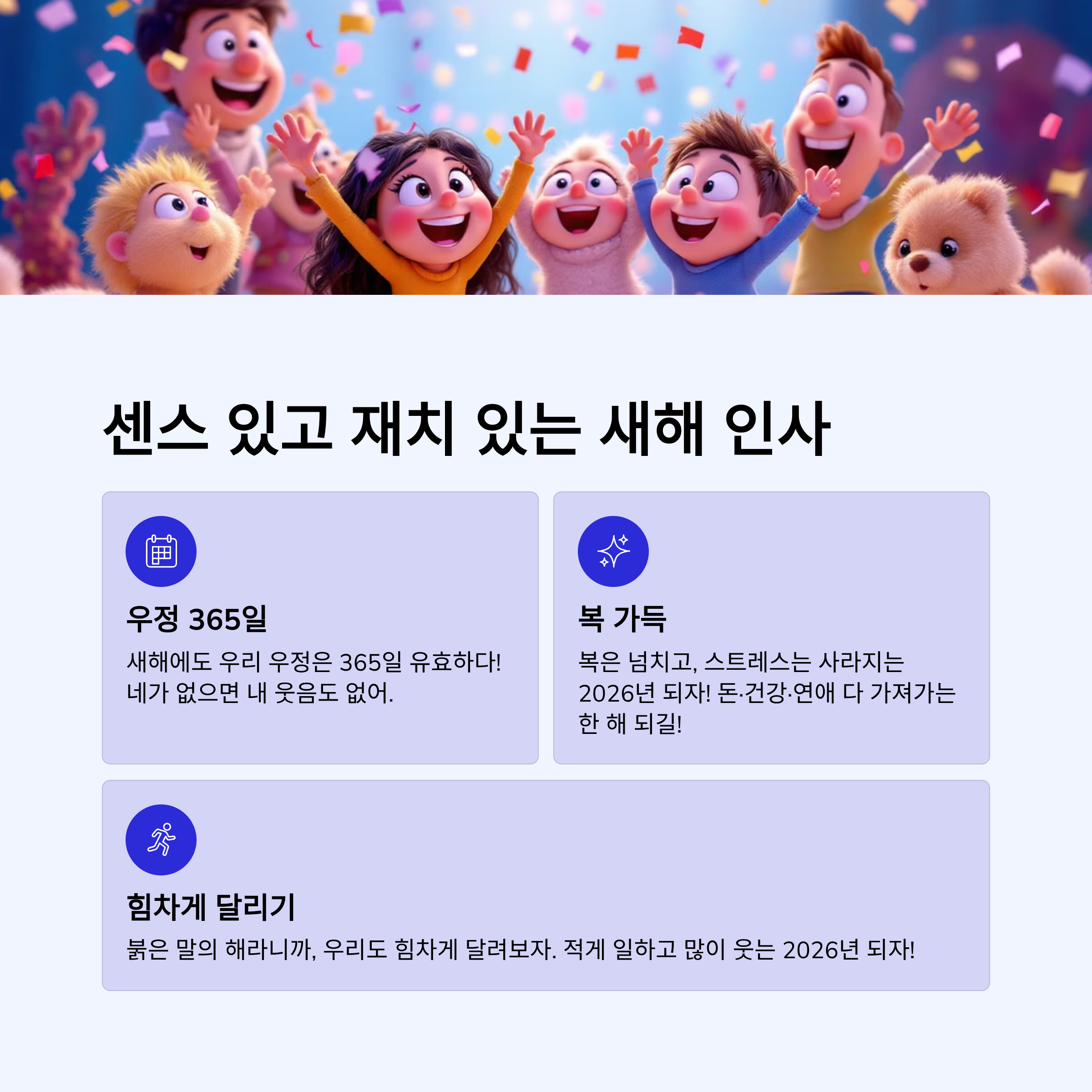 - 올 한 해도 고생 많았다. 2026년에는 네가 바라는 일 모두 대박 나길 진심으로 응원할게. 새해에도 자주 보자!