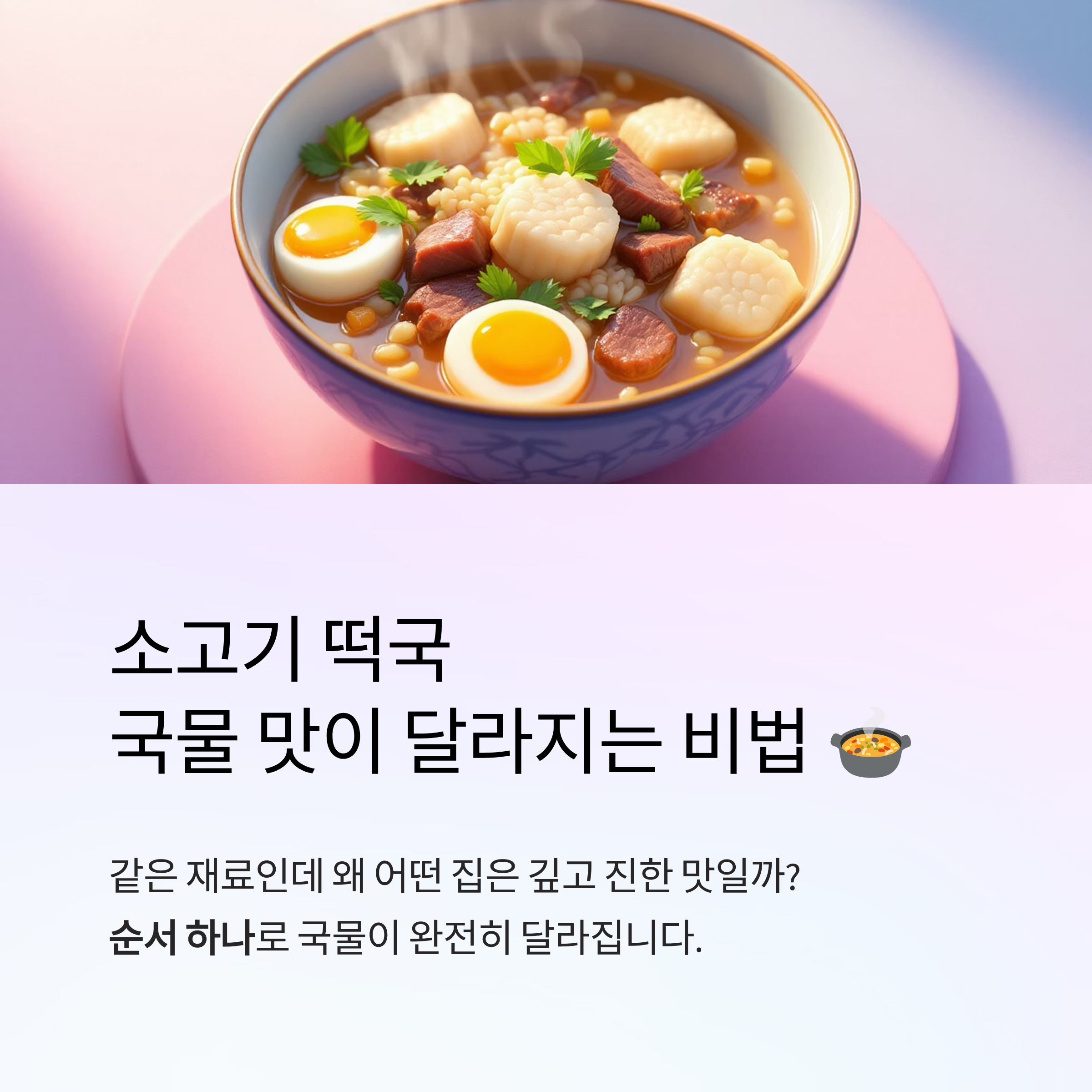 설날 아침 빠질 수 없는 음식, 바로 소고기 떡국입니다. 같은 재료로 끓여도 어떤 집은 국물이 밍밍하고, 어떤 집은 깊고 진한 맛이 나는 이유가 뭘까요?