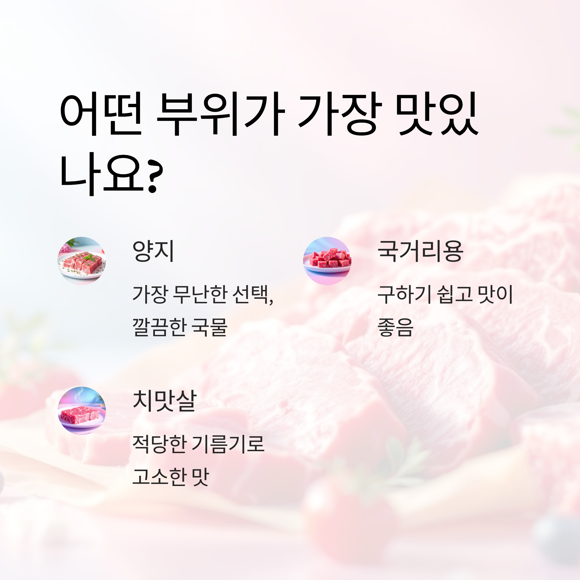 양지나 국거리용이 가장 무난하며, 기름기가 적당히 있는 치맛살도 고소합니다.