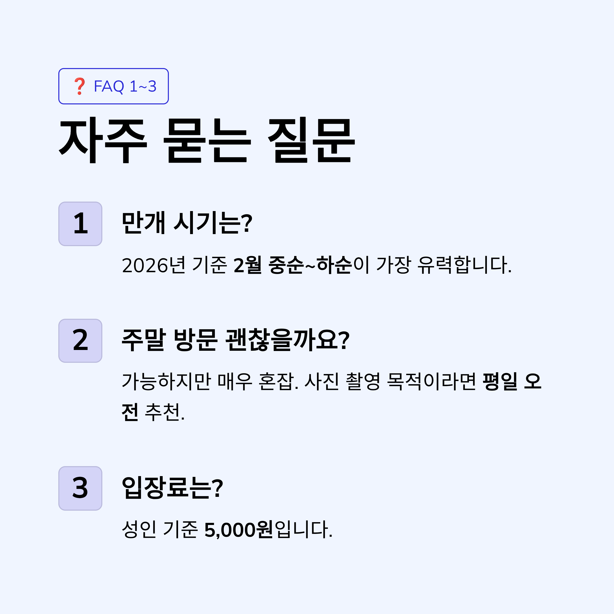 전국에서 가장 이른 개화 소식이 전해지는 만큼, 2월 초부터 이미 많은 방문객이 찾고 있습니다. 만개 시기는 짧기 때문에 타이밍이 무엇보다 중요합니다.