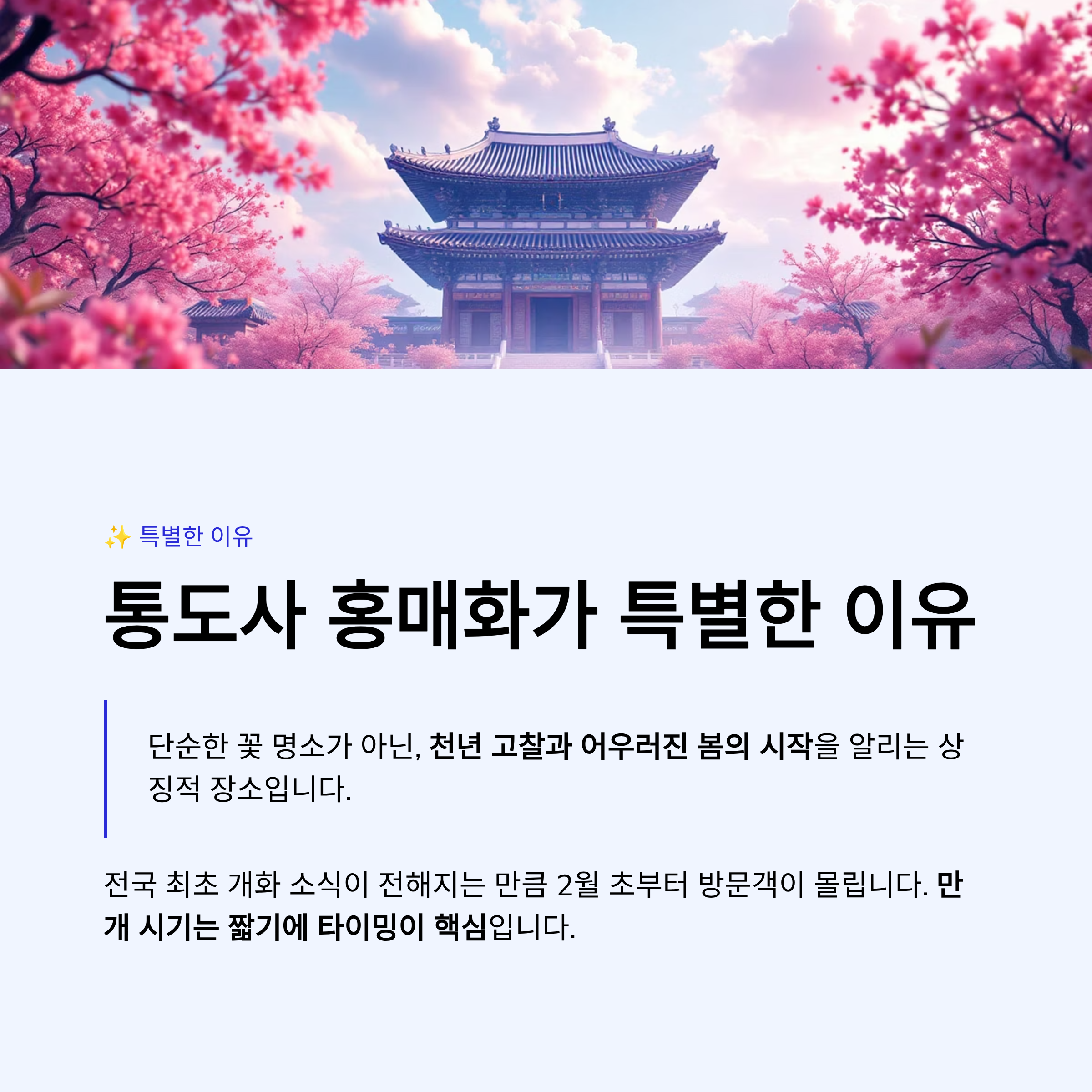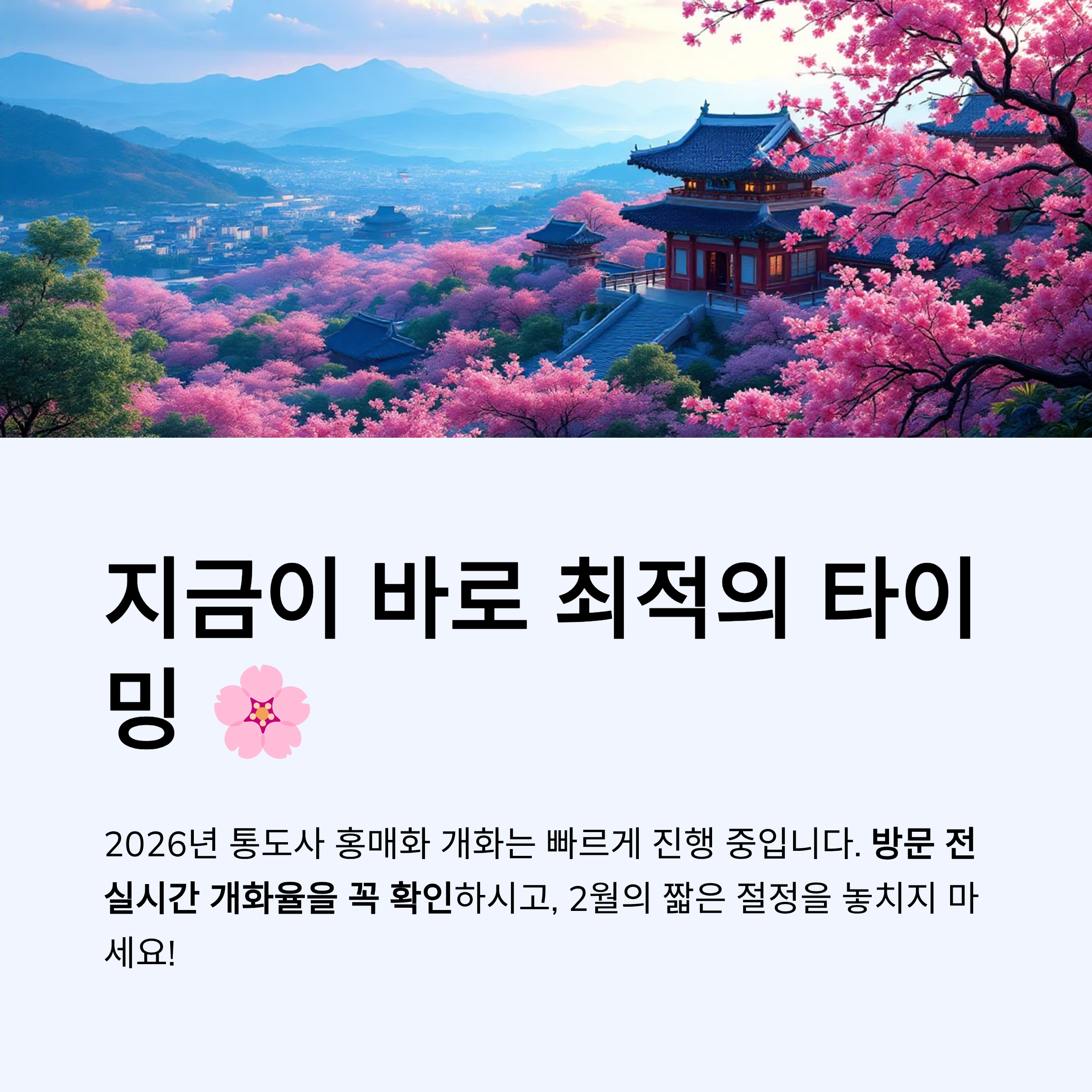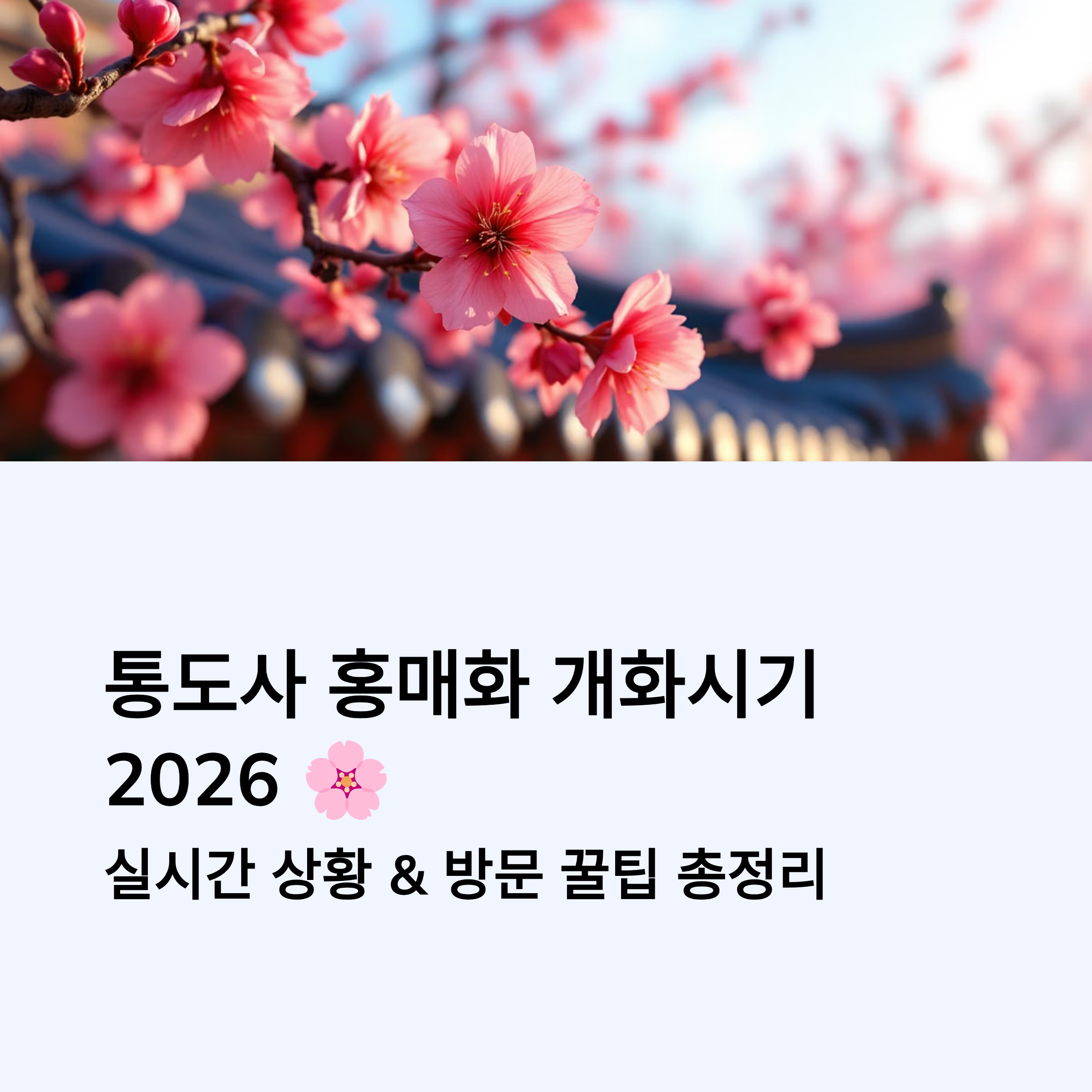 올해 통도사 홍매화 개화시기는 비교적 빠르게 진행되고 있습니다. 방문 전 실시간 개화율을 꼭 확인하시고, 가장 아름다운 순간을 놓치지 마세요.