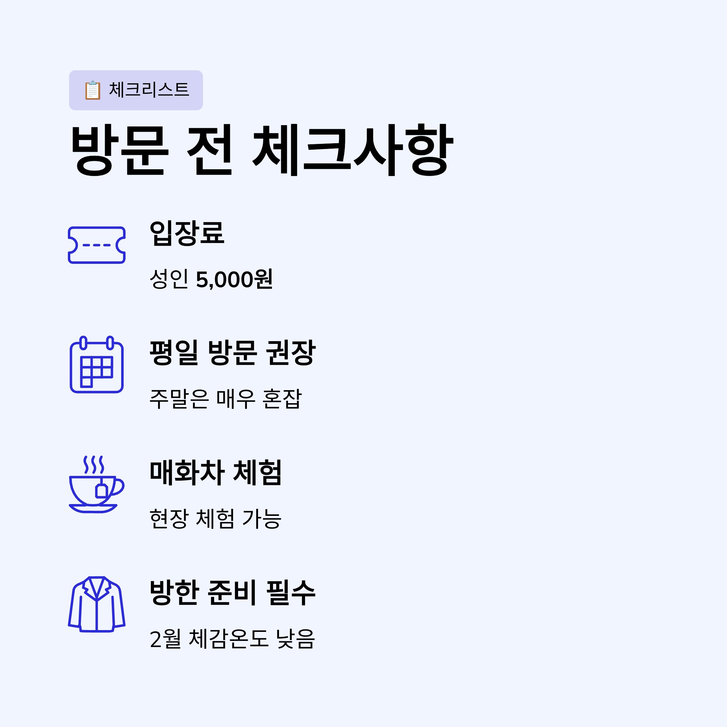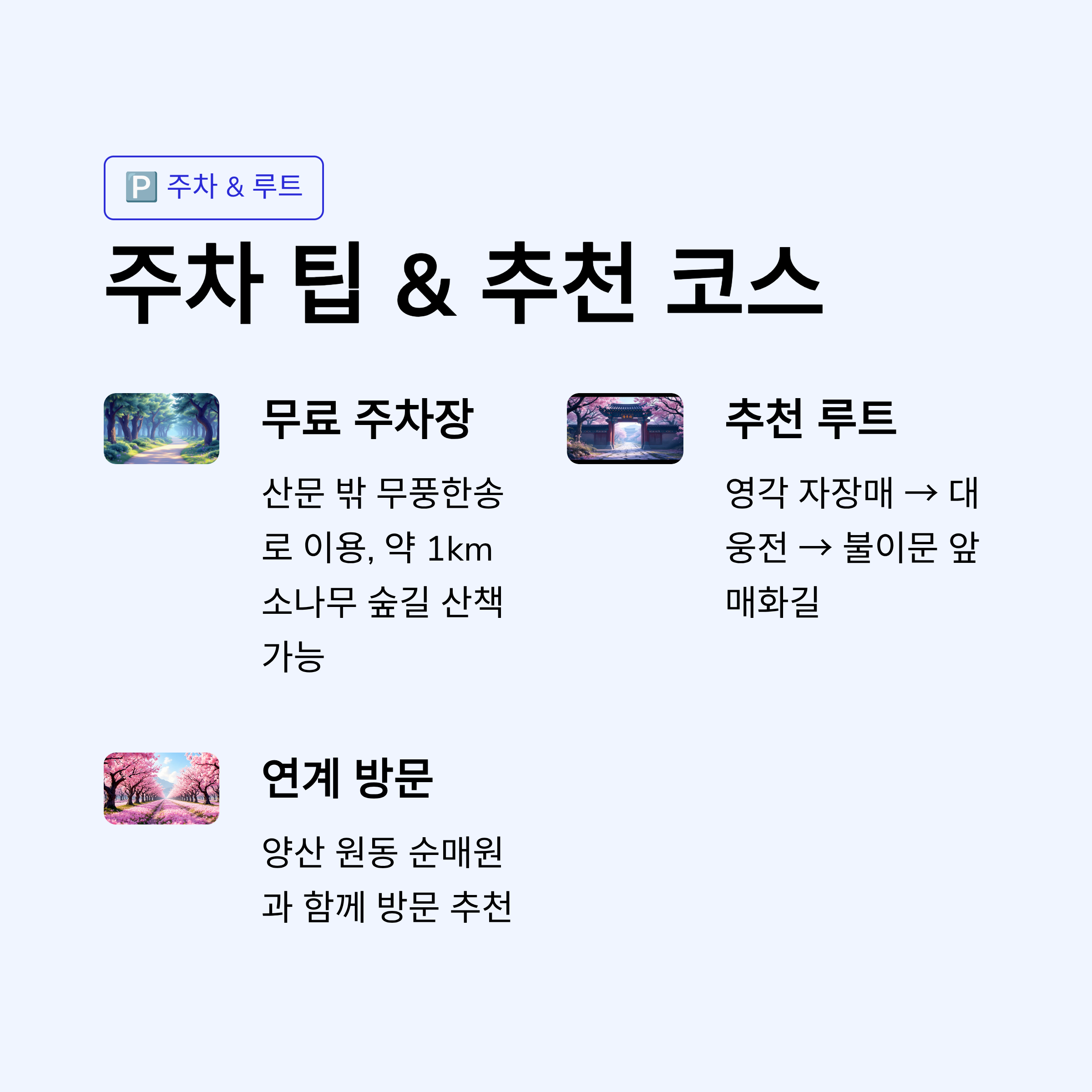 - 주말은 매우 혼잡하므로 평일 방문 권장