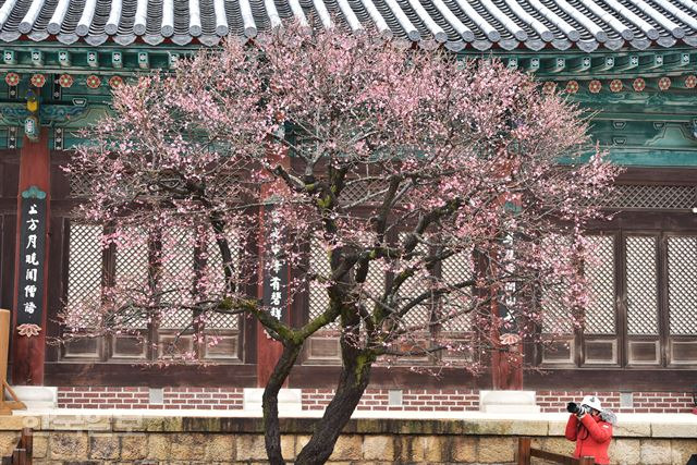 - 붉은 홍매화와 전통 기와의 대비가 아름다운 구도