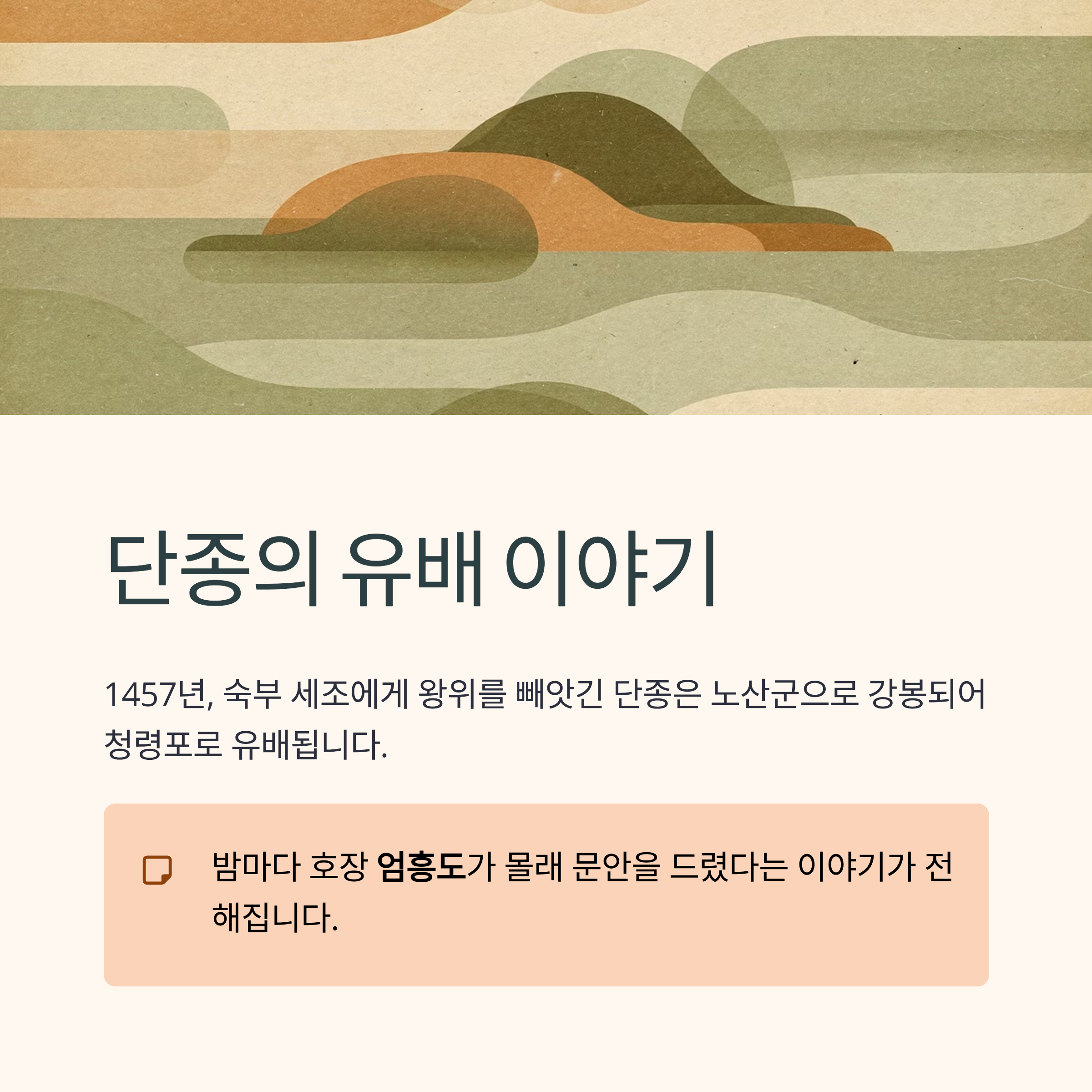 청령포에서 단종은 외부와 거의 단절된 채 생활했습니다. 최소한의 거처만 마련된 상태였으며, 밤마다 호장 엄흥도가 몰래 찾아와 문안을 드렸다는 이야기가 전해집니다.