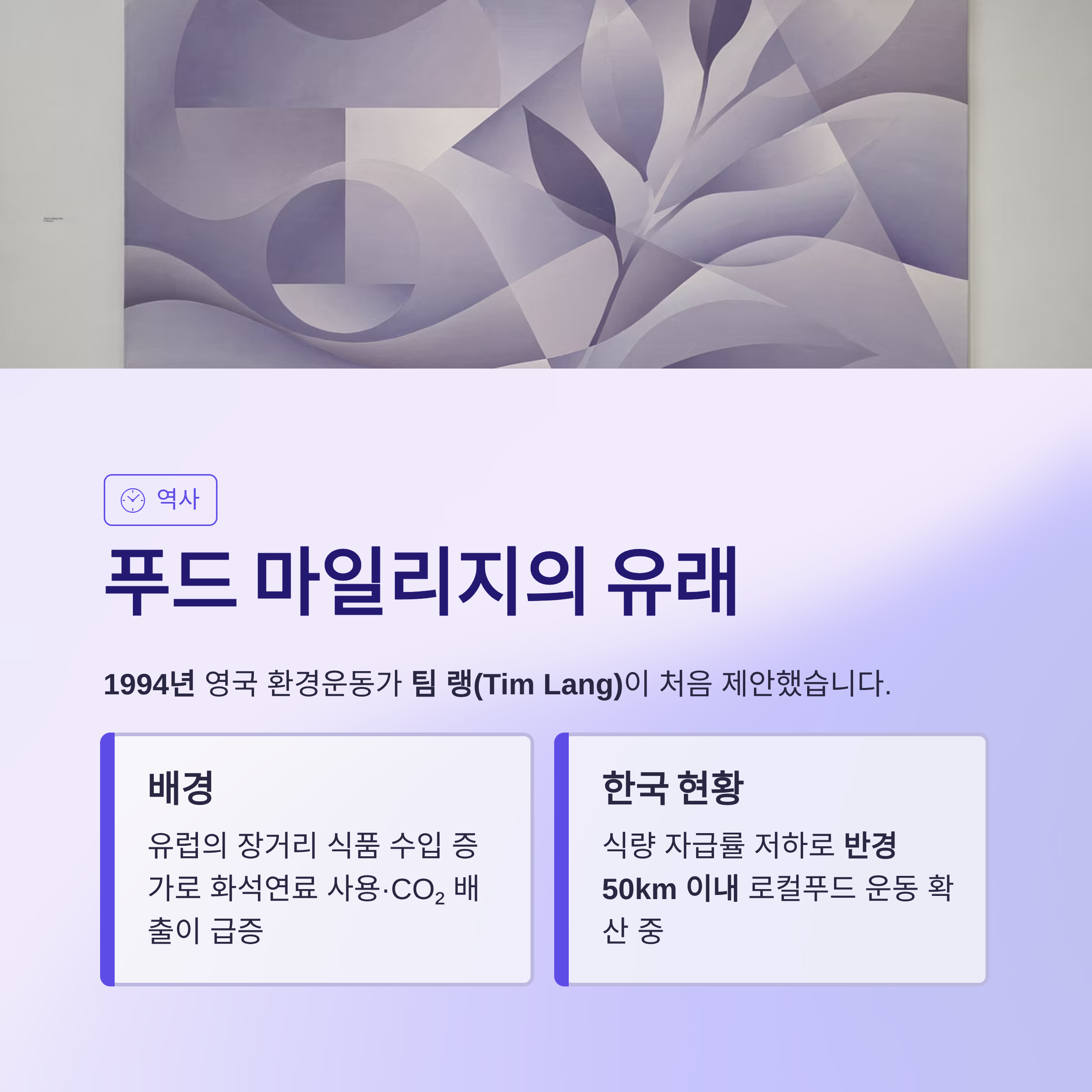 푸드 마일리지는 1994년 영국 환경운동가 "팀 랭(Tim Lang)"이 처음 제안한 개념입니다.