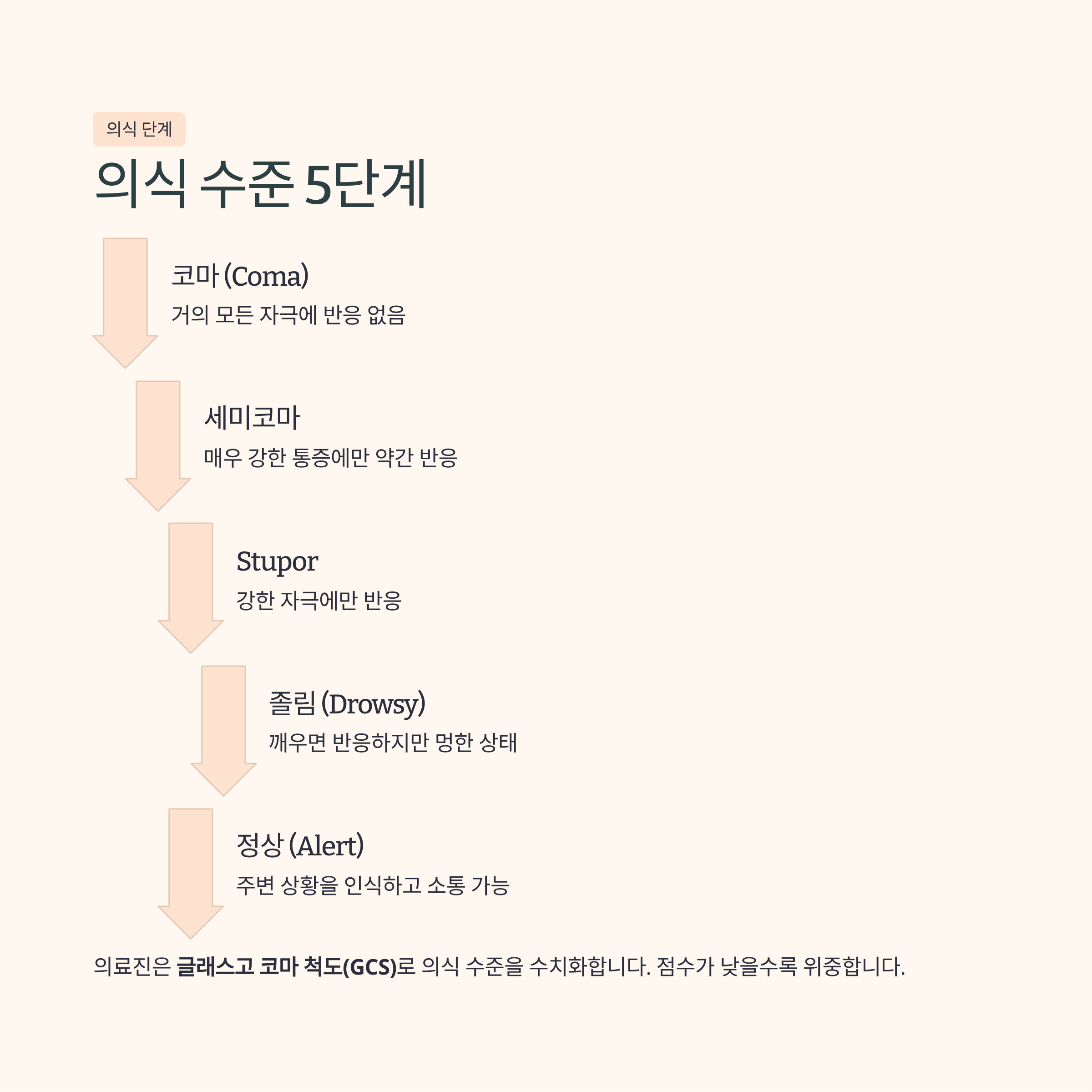 의료진은 환자의 의식 수준을 평가할 때 흔히 **글래스고 코마 척도(GCS)**를 사용해 수치화합니다. 점수가 낮을수록 상태가 위중하다는 의미입니다.