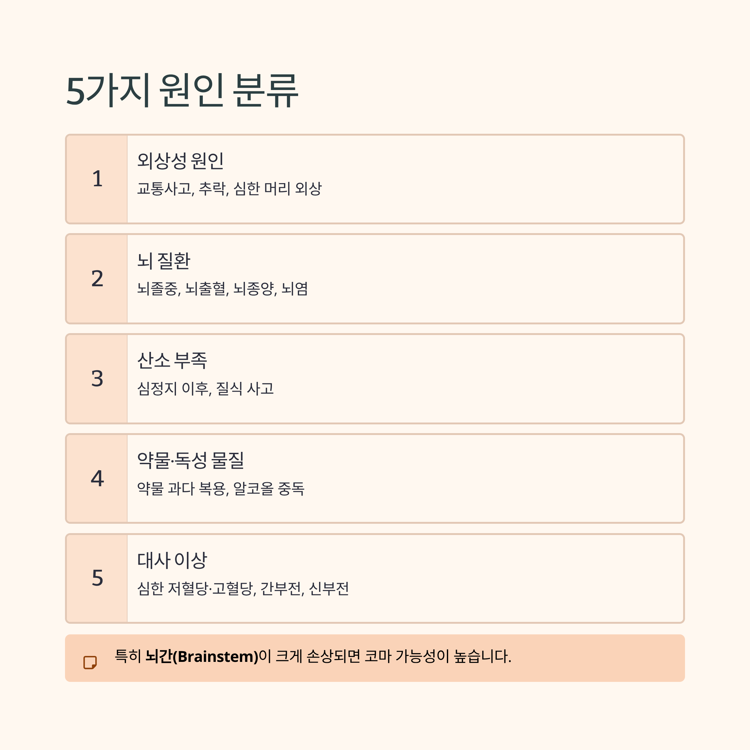 - 코마의 원인 (외상, 뇌졸중, 저산소 등)