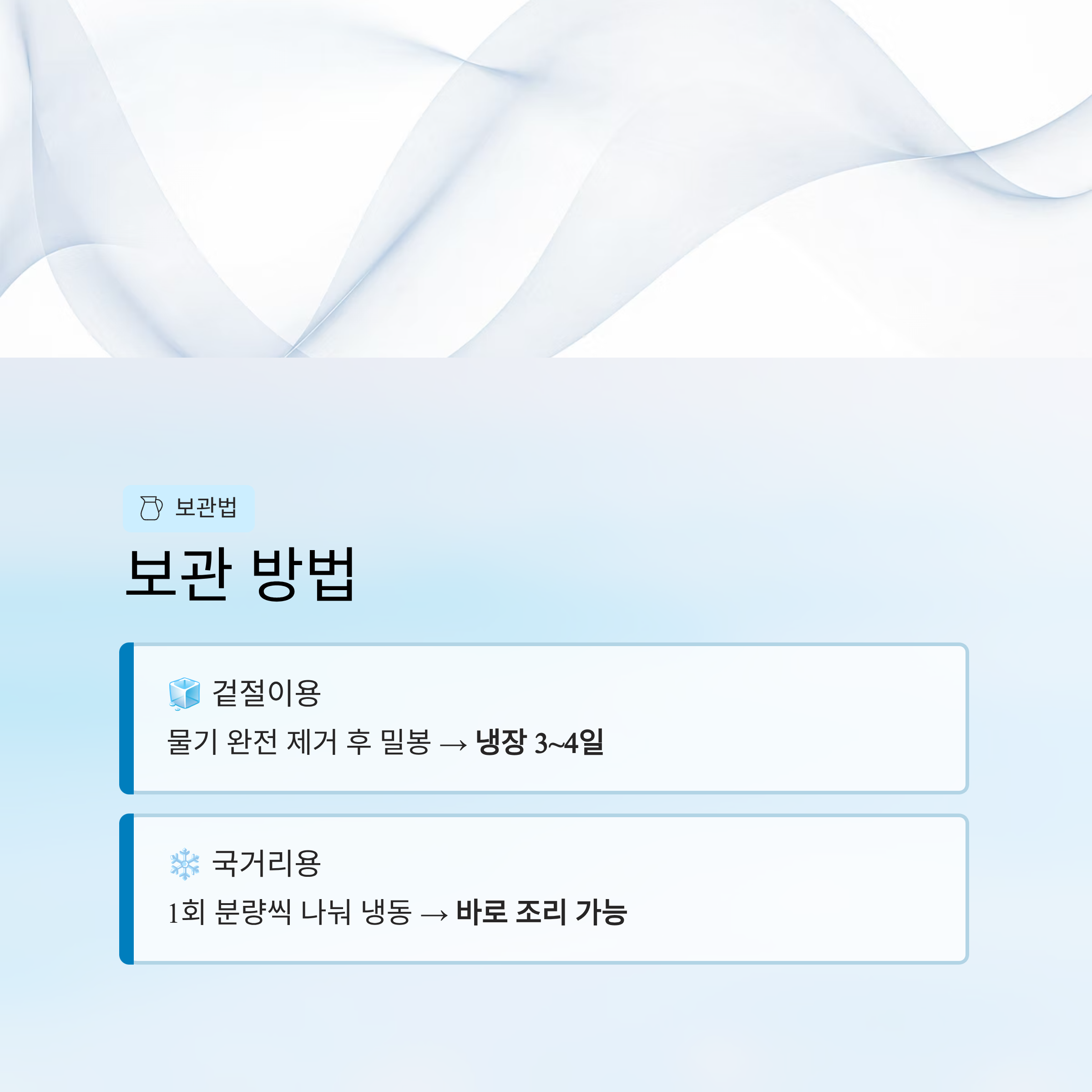 - 국거리용: 한 번 먹을 분량씩 나눠 냉동 → 바로 조리 가능