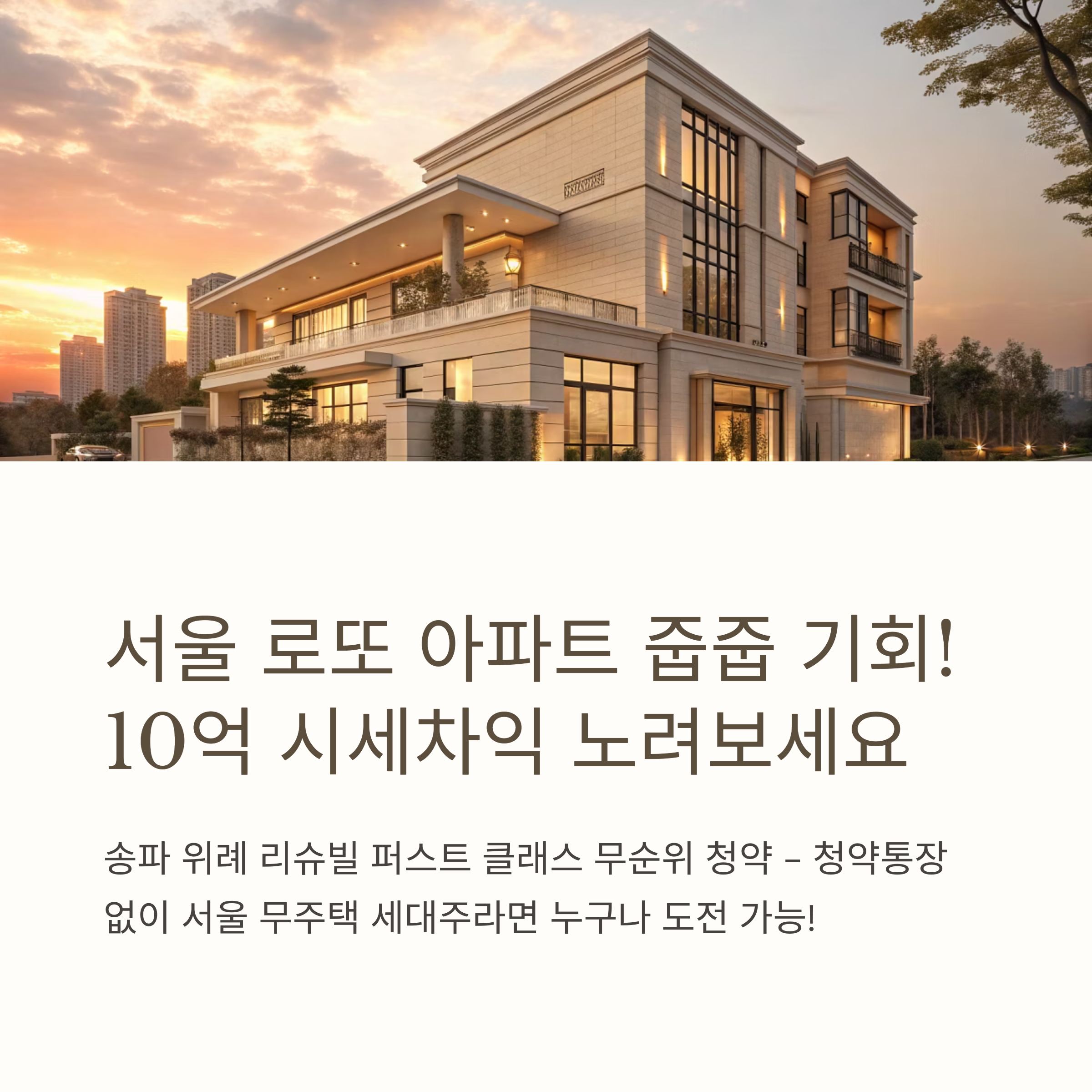 단 1가구 공급에 시세차익 최대 10억 예상, 청약통장 없이 서울 무주택 세대주 누구나 신청 가능!