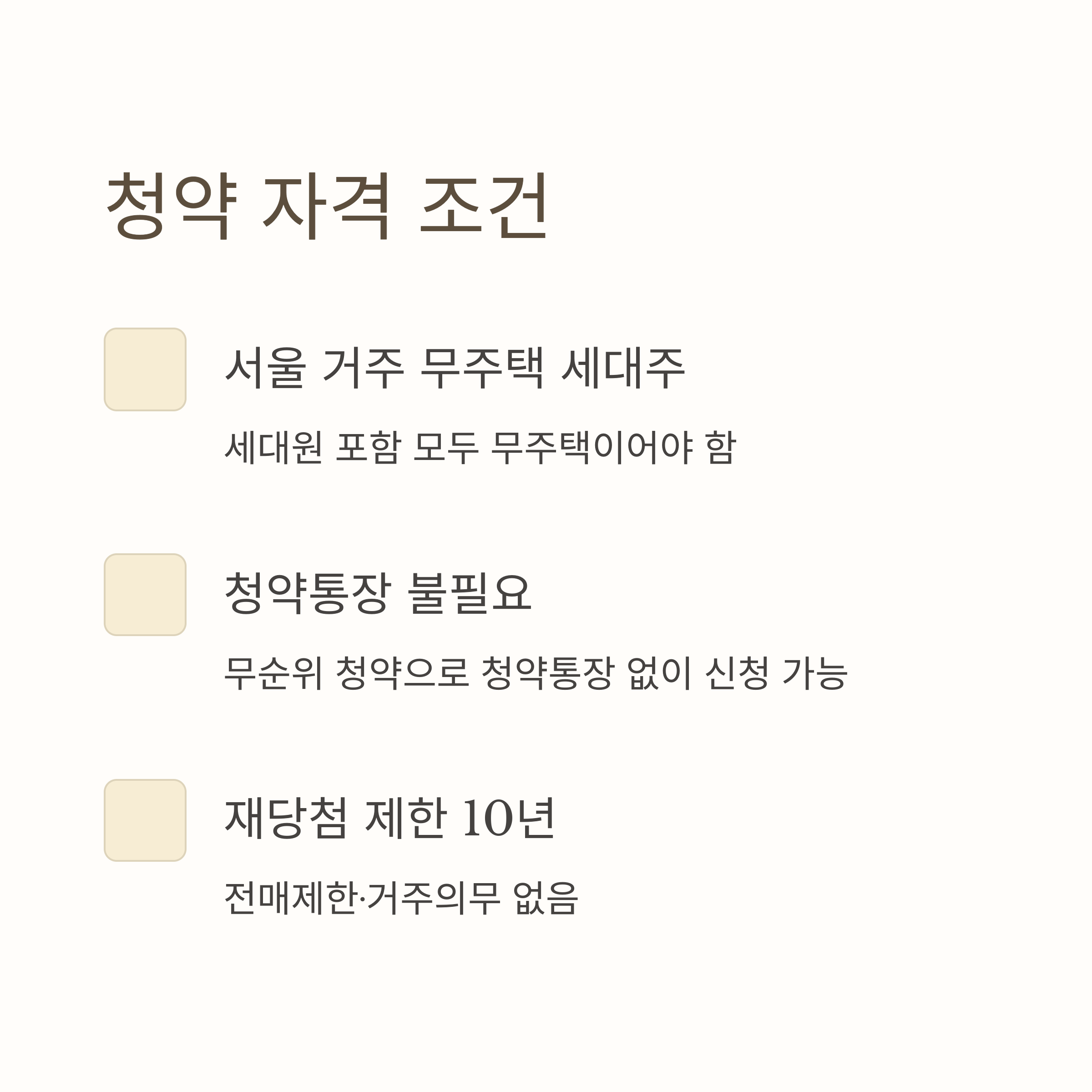 - 청약통장 필요 없음, 재당첨 제한 10년, 전매제한·거주의무 없음