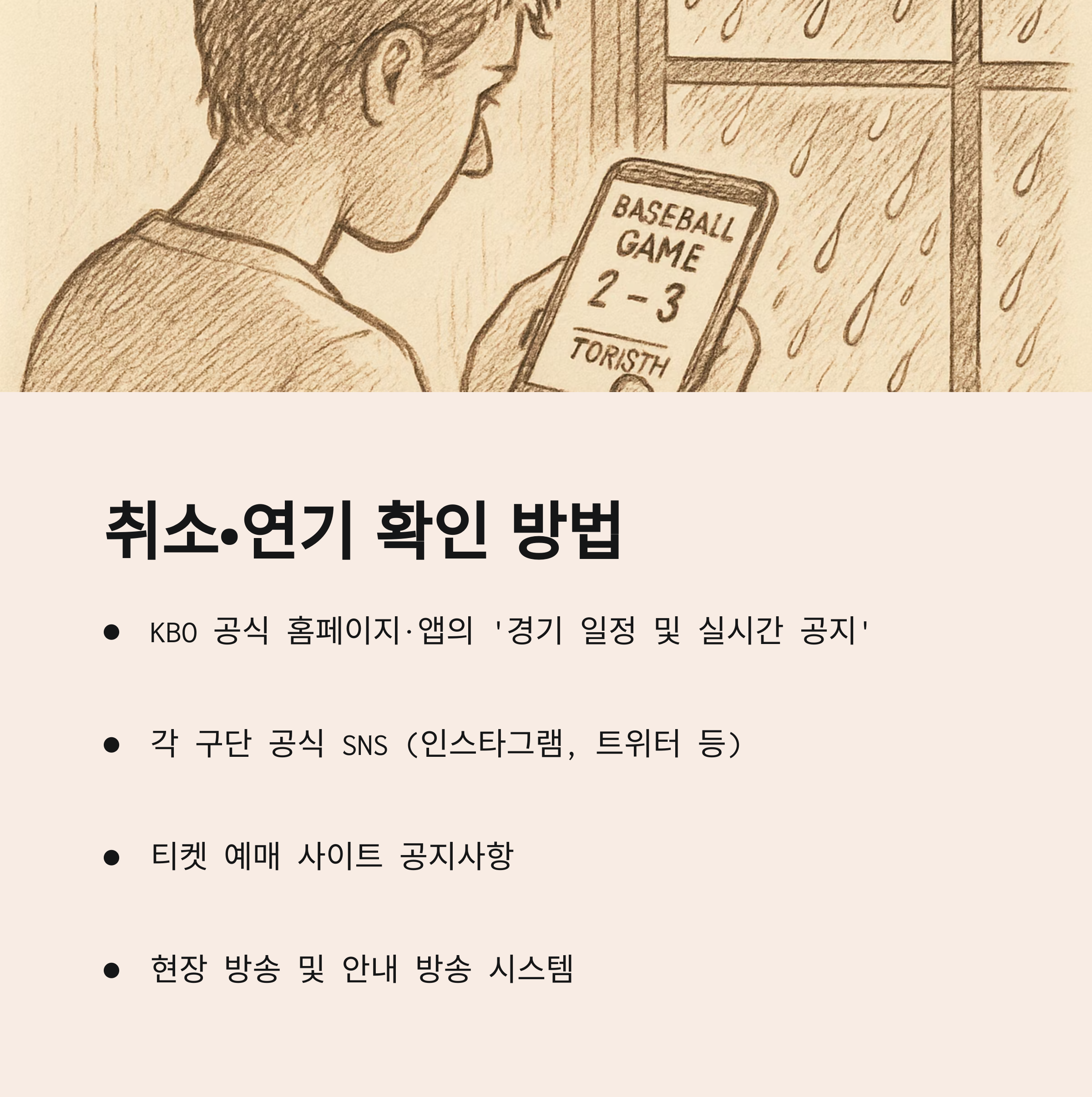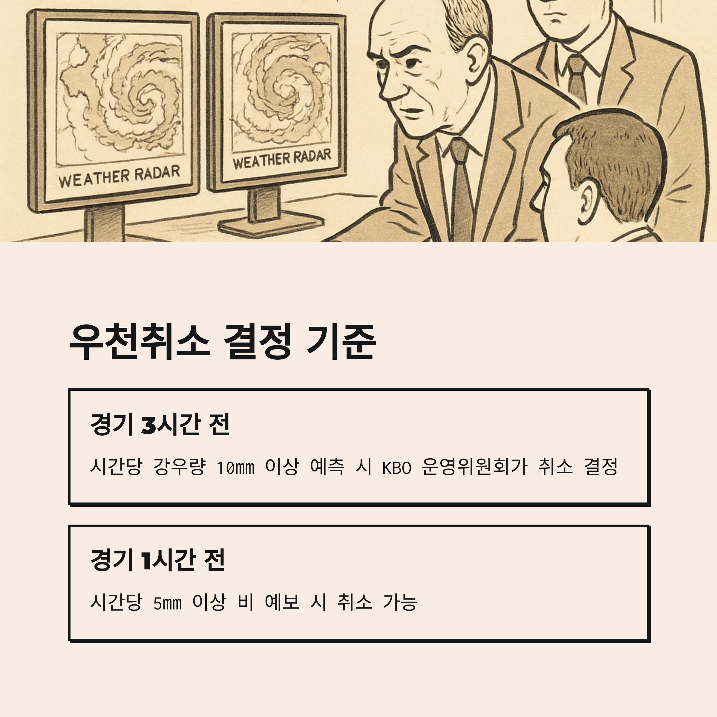 - 3시간 전 기준: 시간당 강우량이 10㎜ 이상 지속될 것으로 예측되면 KBO 운영위원회가 취소 결정