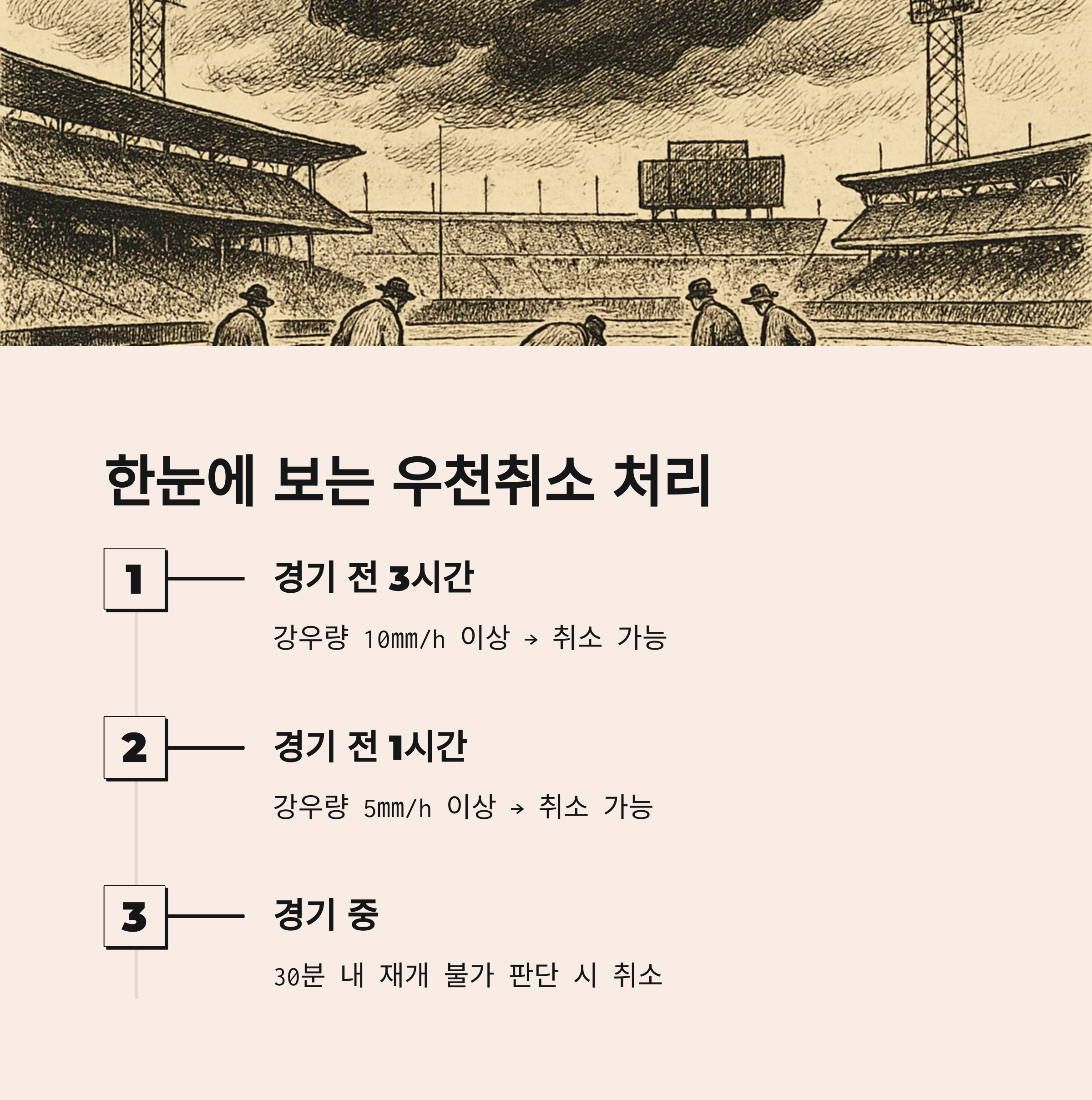 | 경기 전 3시간 전 | 강우량 10㎜/h 이상 → 취소 가능 |