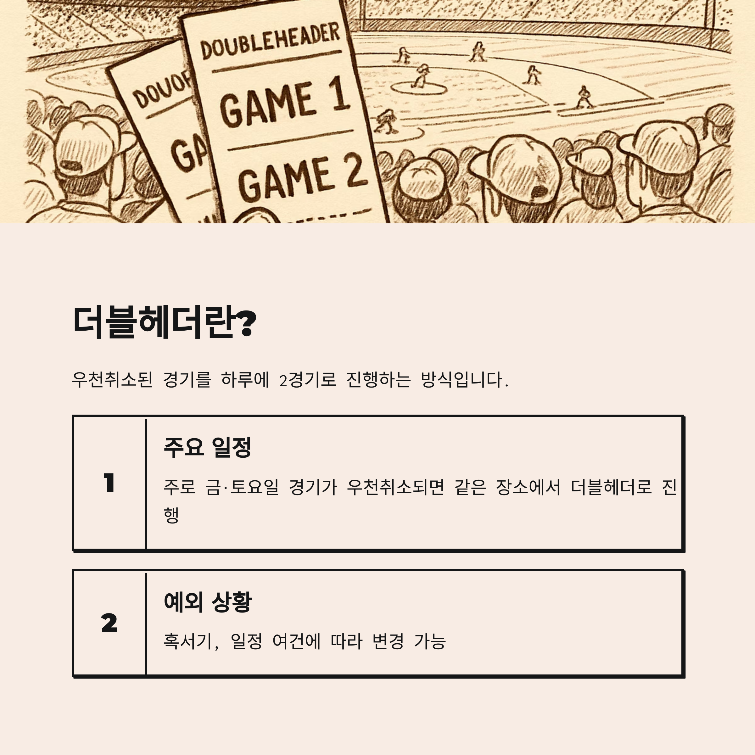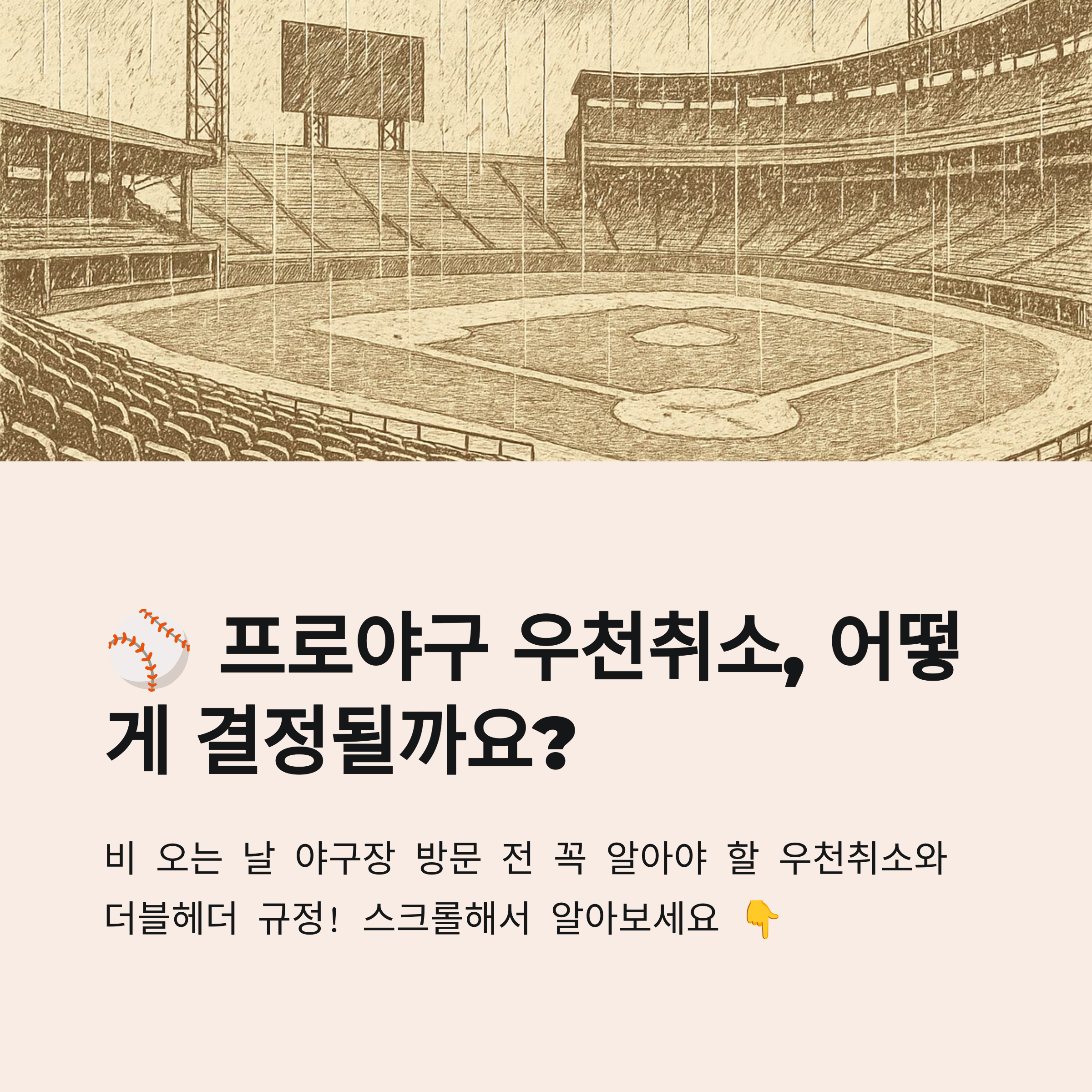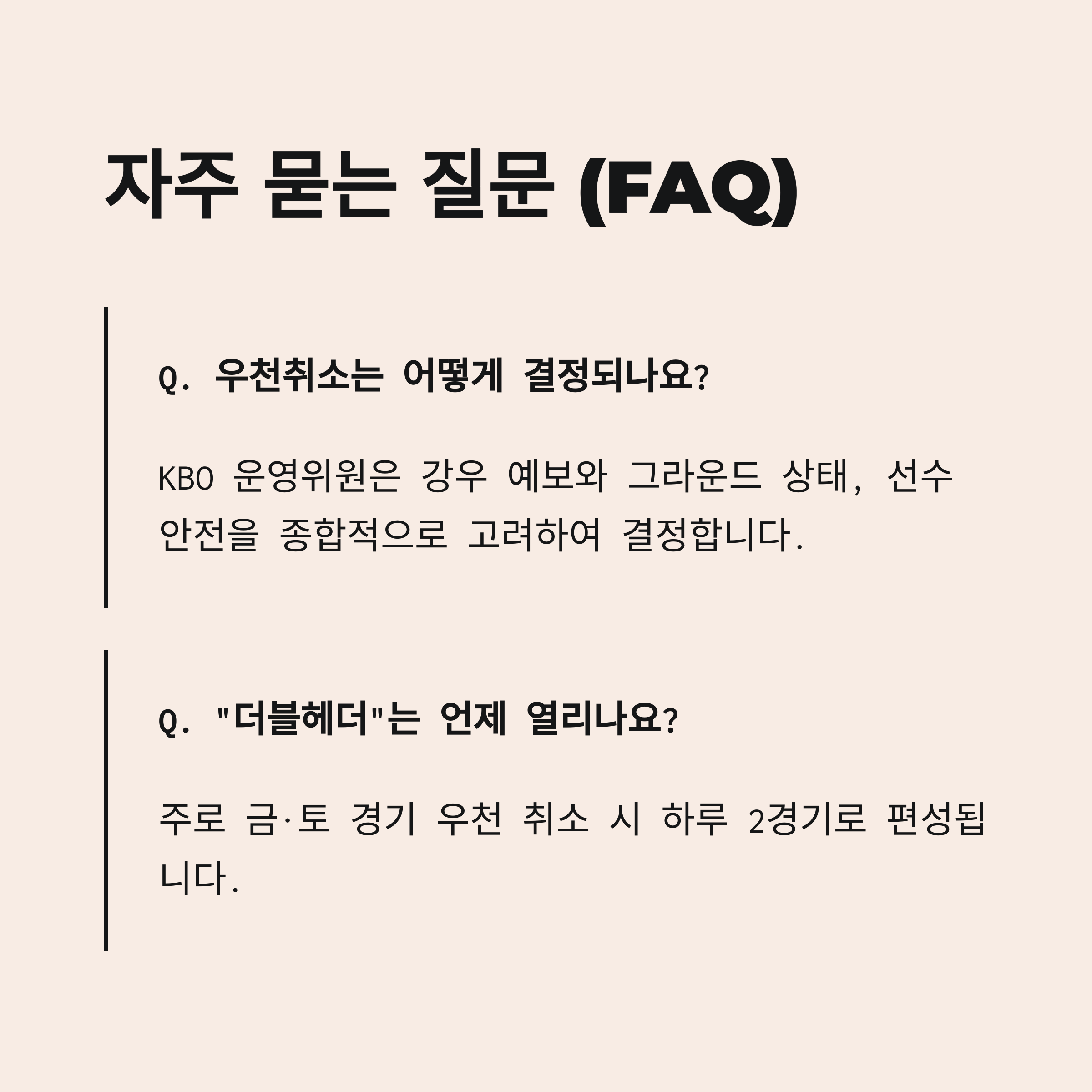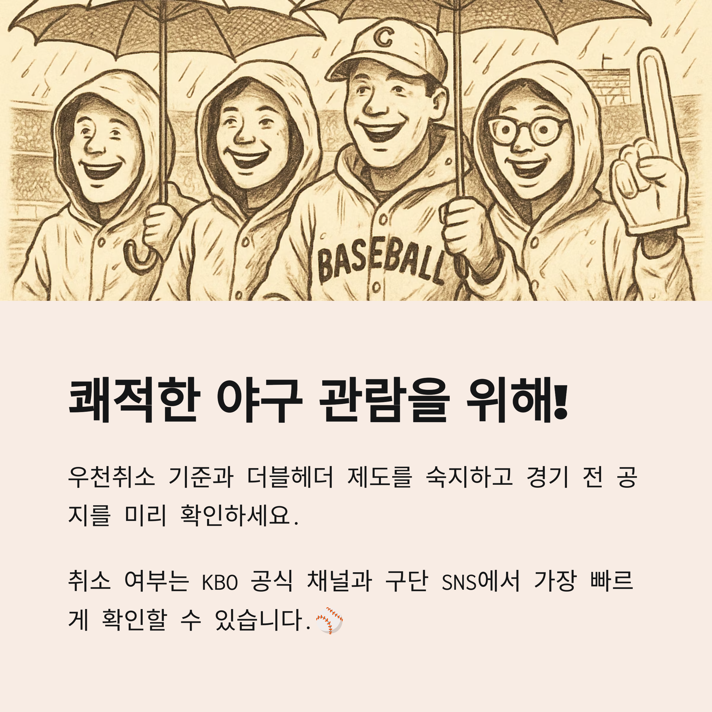 쾌적한 관람과 안전한 응원을 위해, 우천취소 기준과 더블헤더 제도를 숙지하고 경기 전 공지를 미리 확인하세요!
