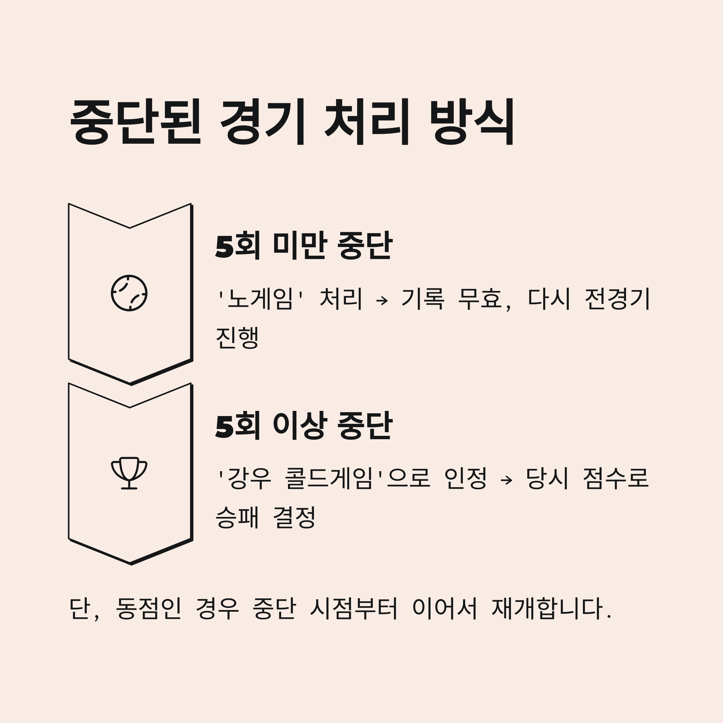 | 5회 미만 중단 | ‘노게임’ → 기록 무효, 전경기 재개 |