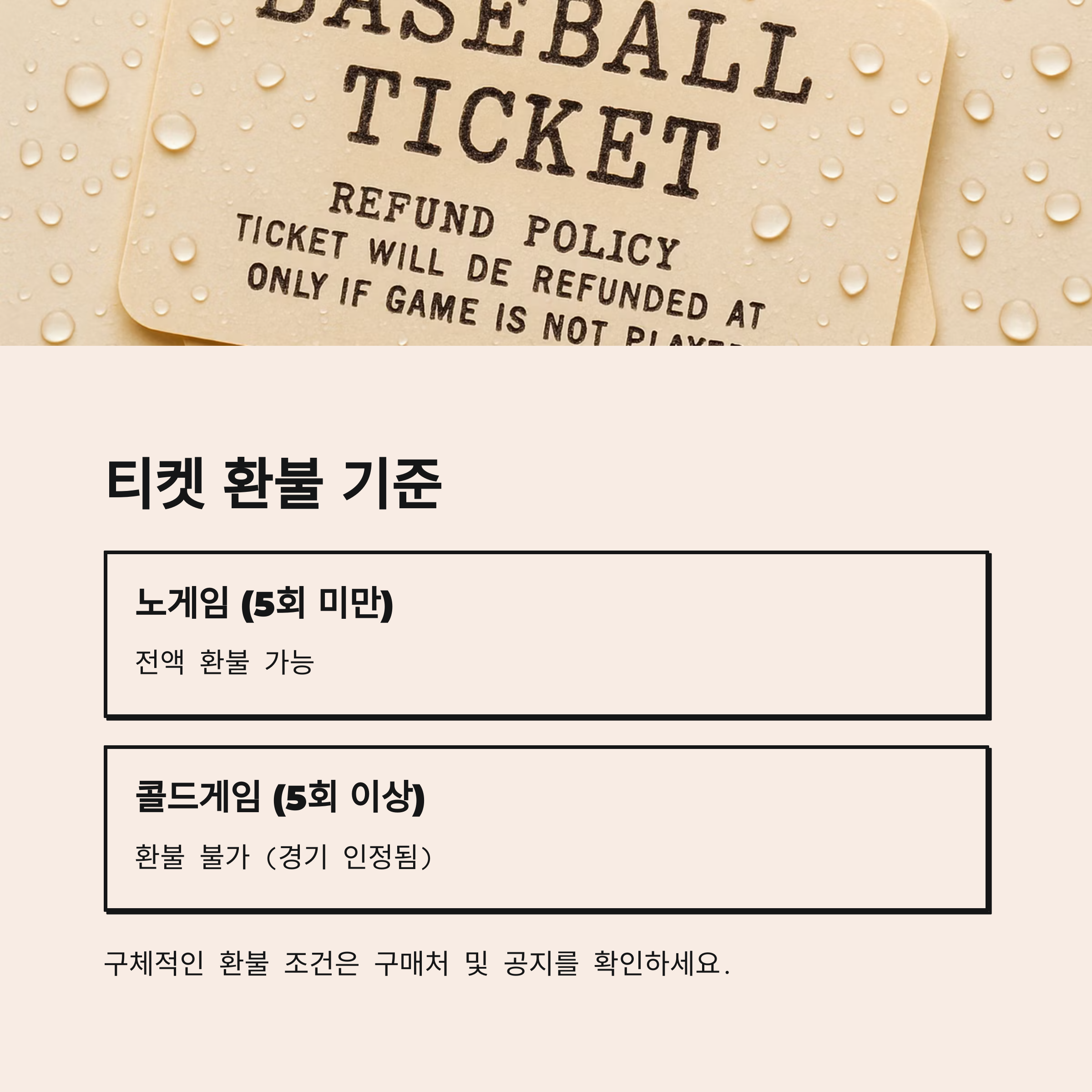 - 강우 콜드게임일 경우: 환불 불가 (경기 인정됨)