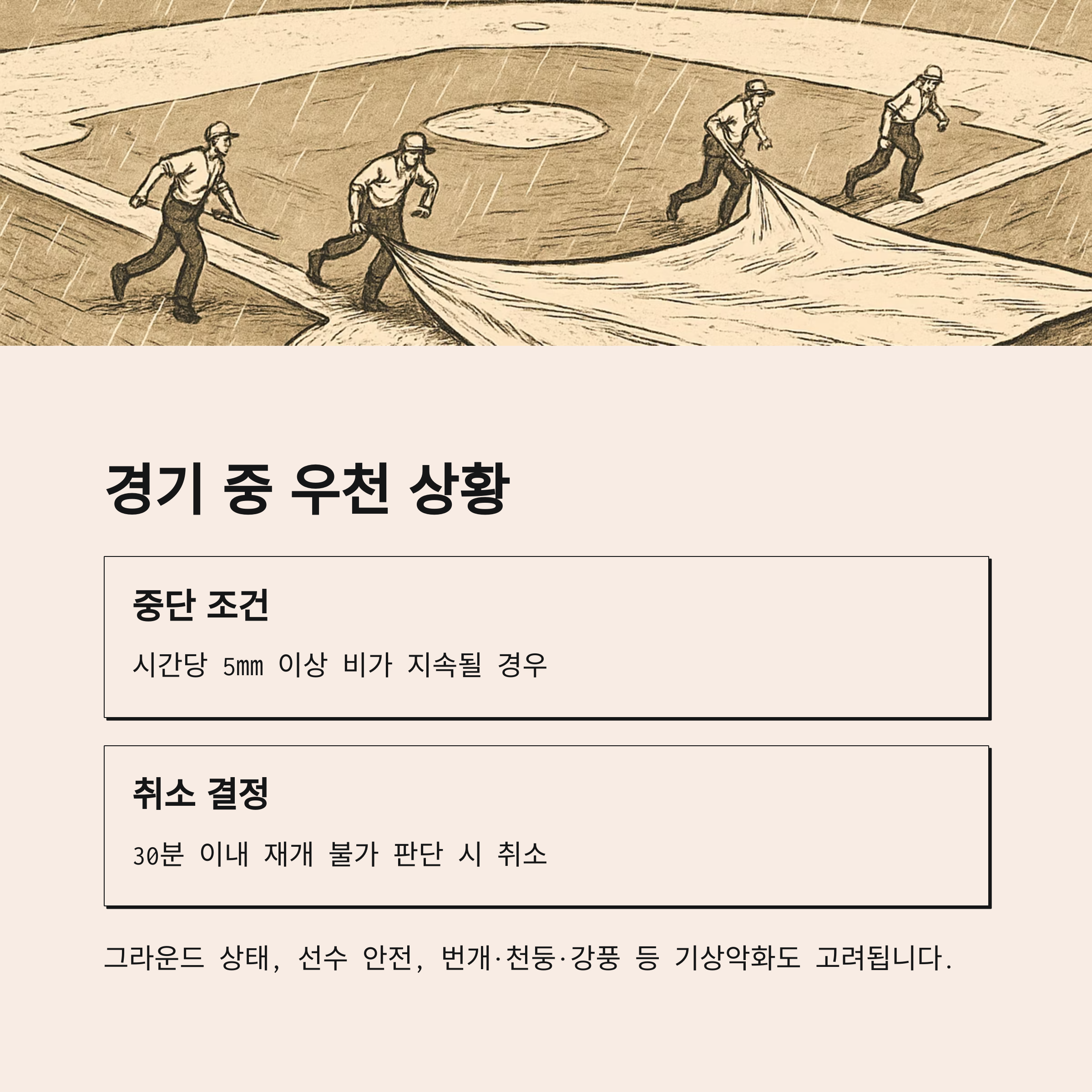| 경기 중 | 비·그라운드 상태 등으로 중단하고 30분 내 재개 불가 판단 시 취소 |