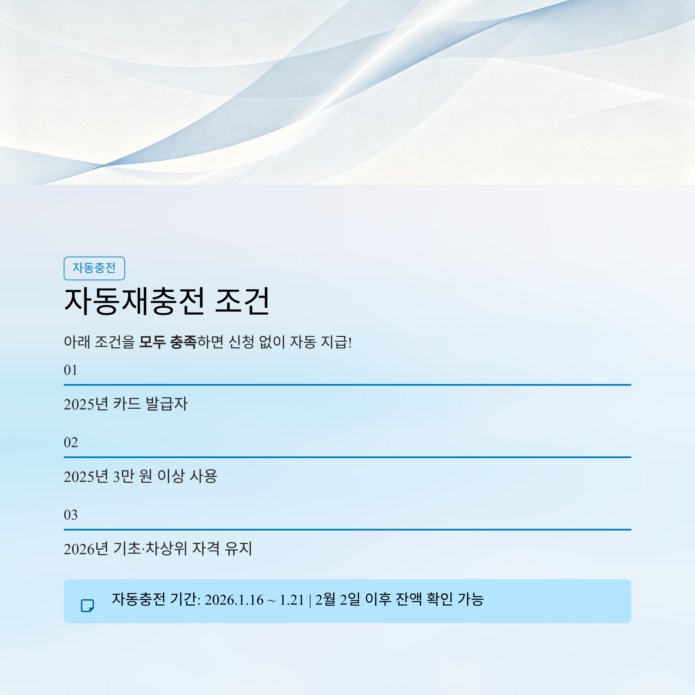 ✔ 2025년에 3만 원 이상 사용 + 자격 유지 → 2026년 자동충전