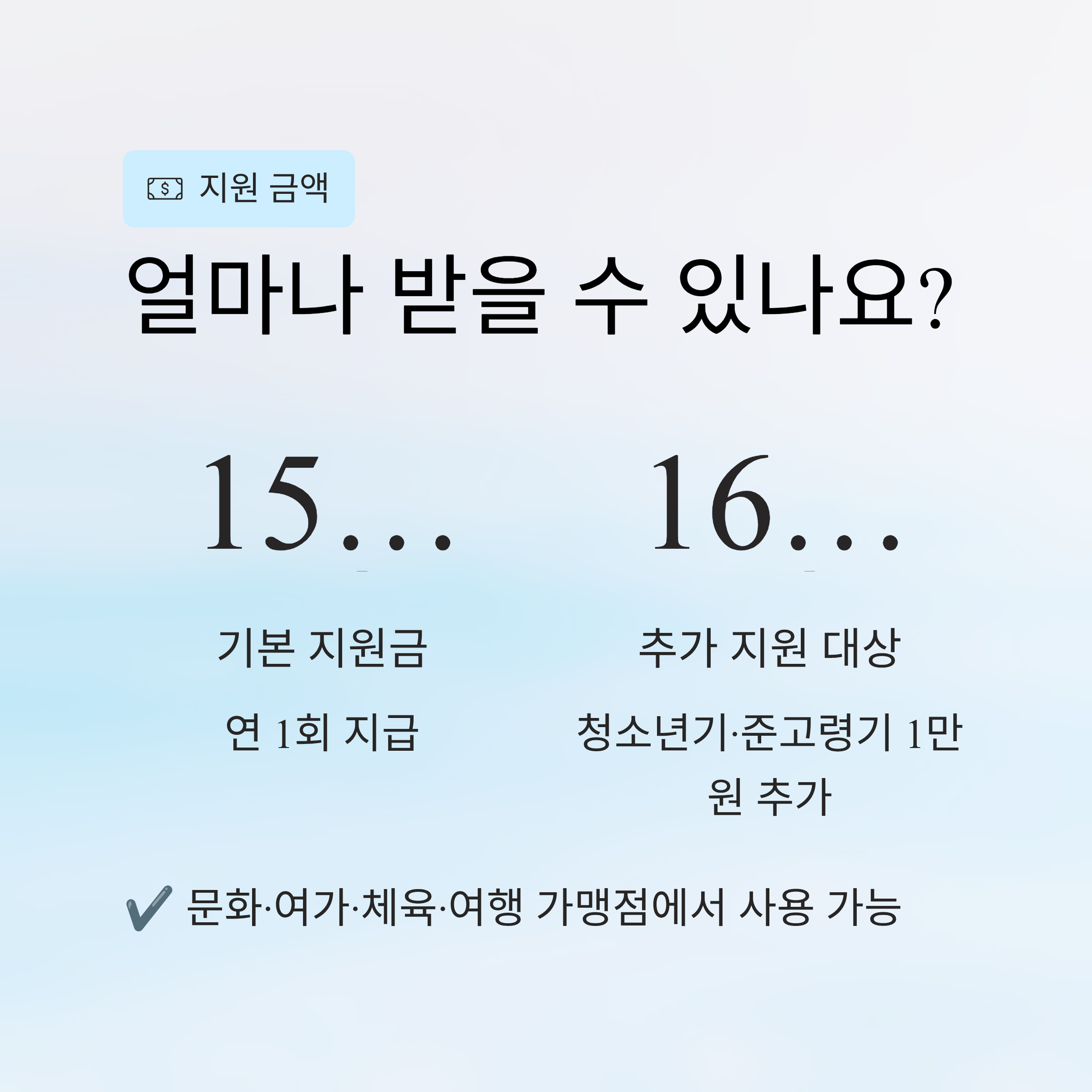- 생애주기 추가지원 대상(청소년기·준고령기): 1만 원 추가 → 총 16만 원