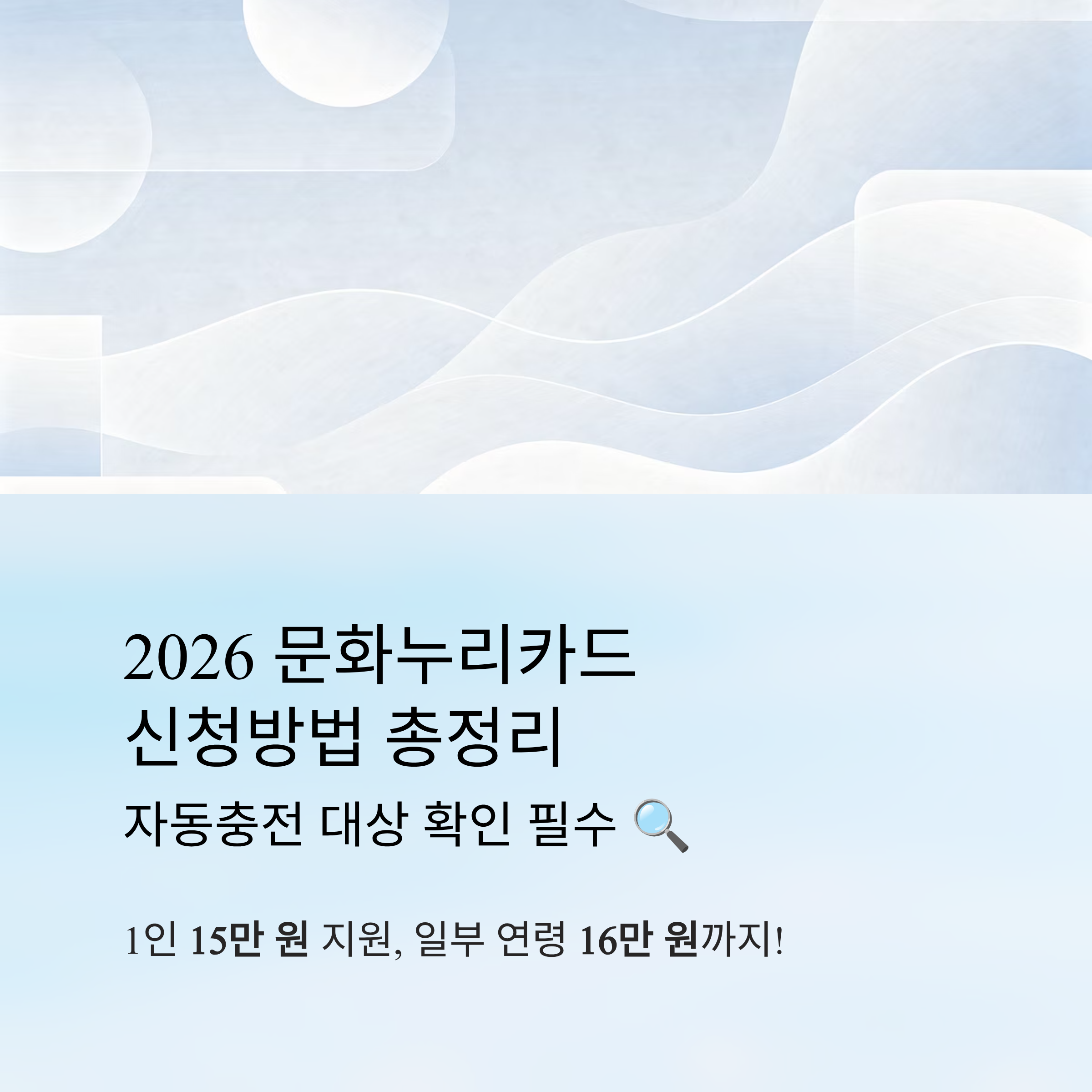 2026년 문화누리카드 신청이 곧 시작됩니다. 올해는 1인당 15만 원, 일부 연령은 16만 원까지 지원되며, 조건을 충족하면 별도 신청 없이 자동충전됩니다.
