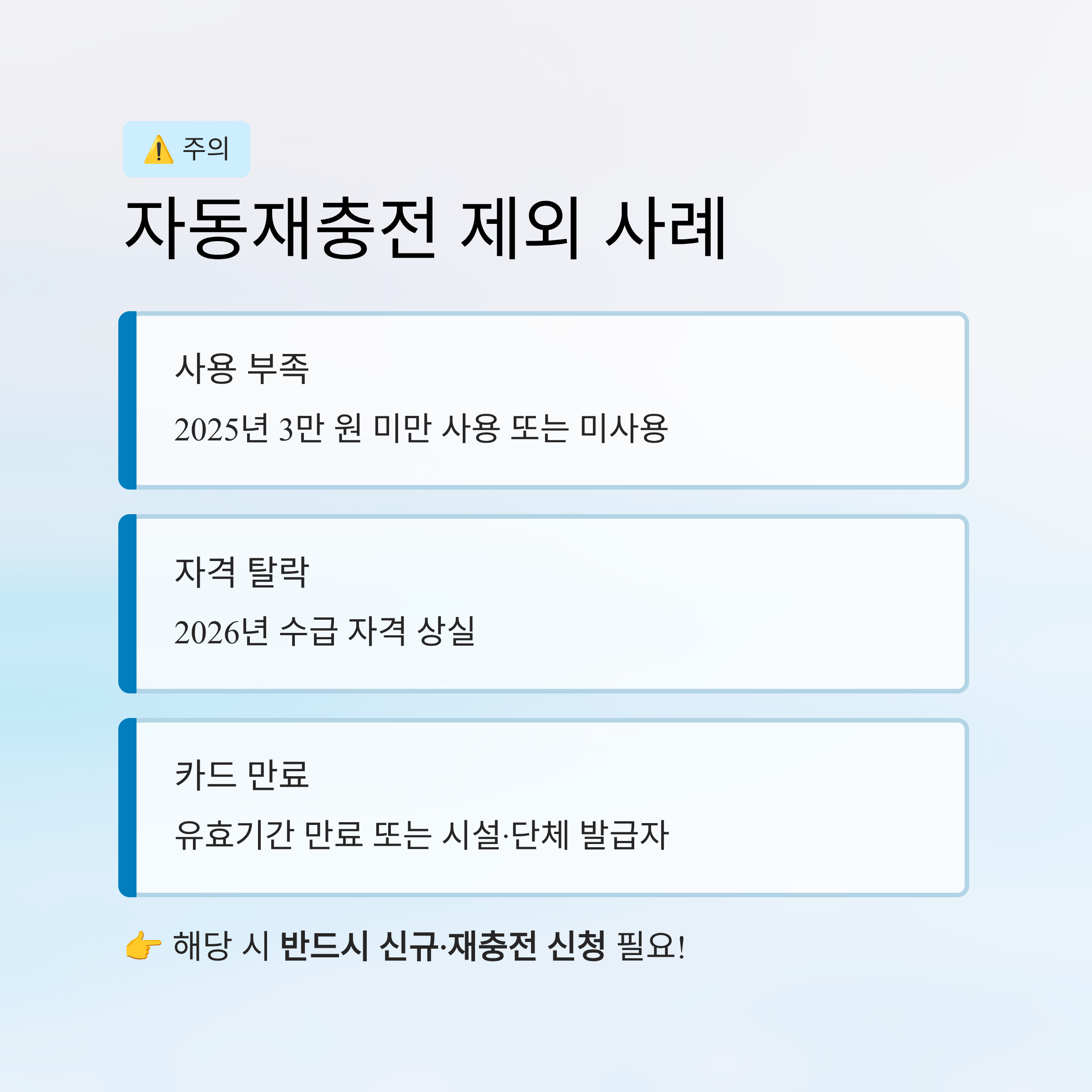 3만 원 미만 사용 시 자동충전 대상 제외 → 2026년 재신청 필요합니다.
