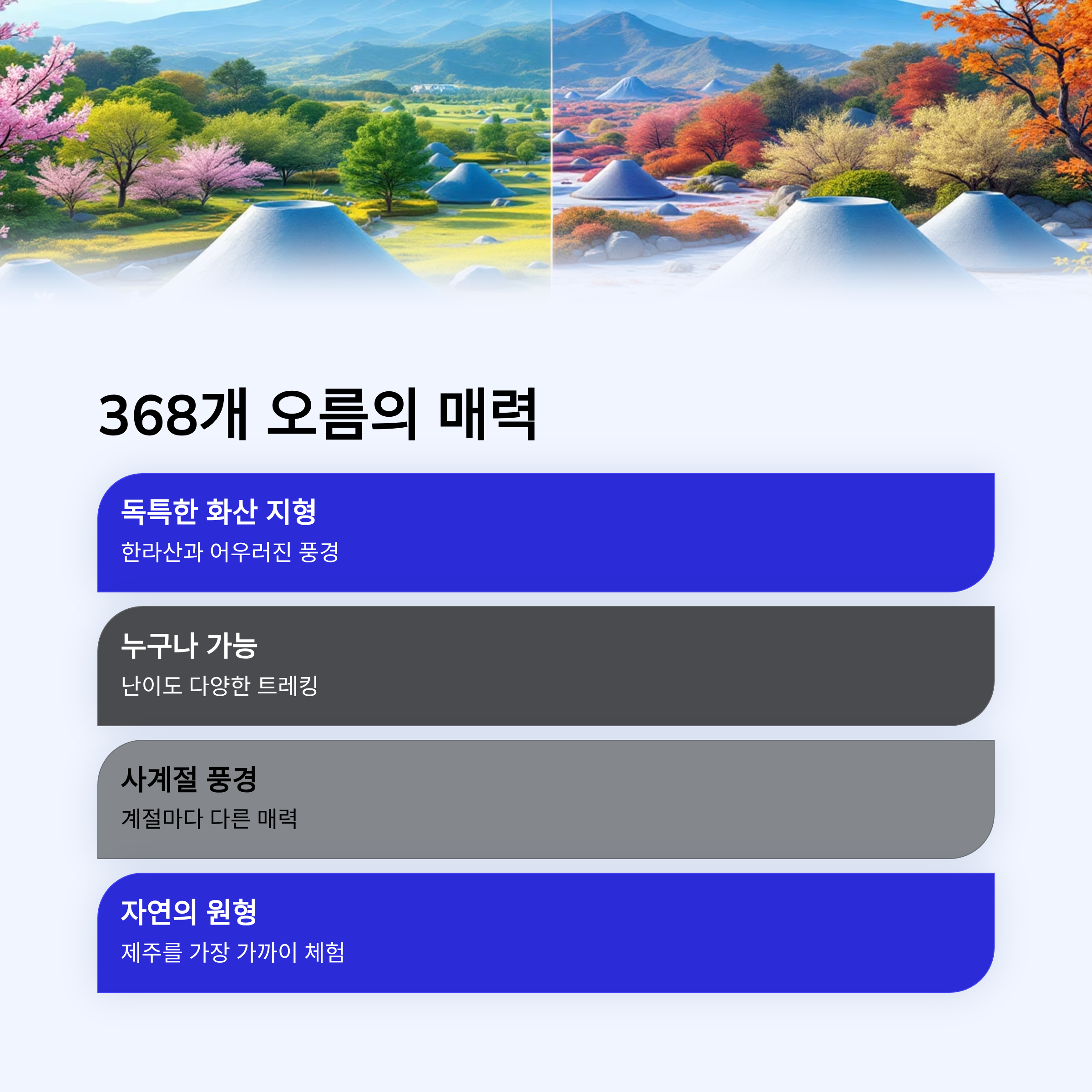 제주도에는 총 368개의 오름이 있습니다. 한라산을 중심으로 중산간 지역에 분포한 기생화산으로, 제주만의 독특한 화산 지형을 형성합니다. 제주 여행에서 오름 트레킹은 빼놓을 수 없는 코스인데요. 이번 글에서는 제주 368개 오름의 의미, 분포, 대표 오름 특징, 난이도별 추천 코스까지 한 번에 정리해드립니다.