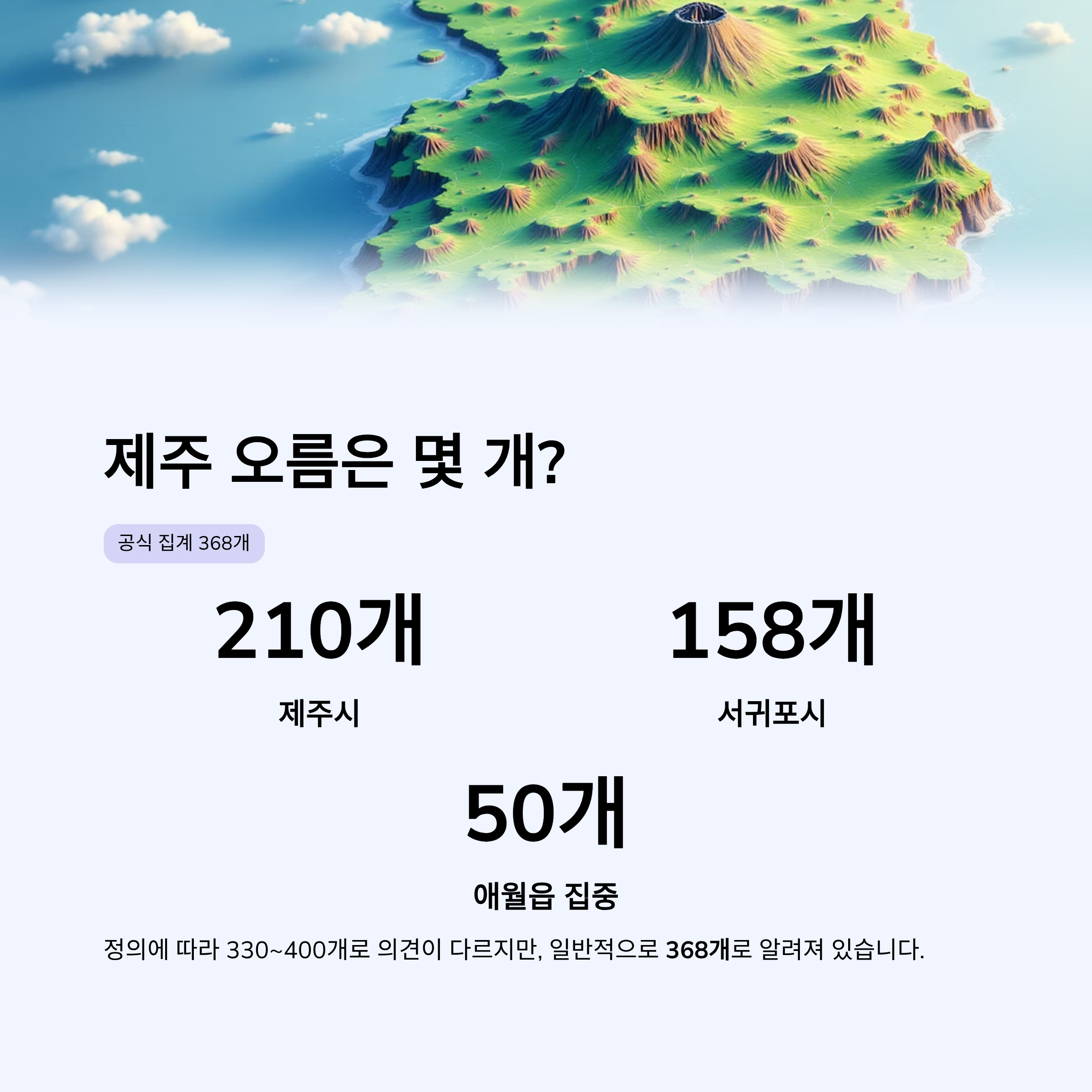 정의에 따라 330~400개로 의견이 다르지만, 일반적으로 제주 368개 오름으로 알려져 있습니다.