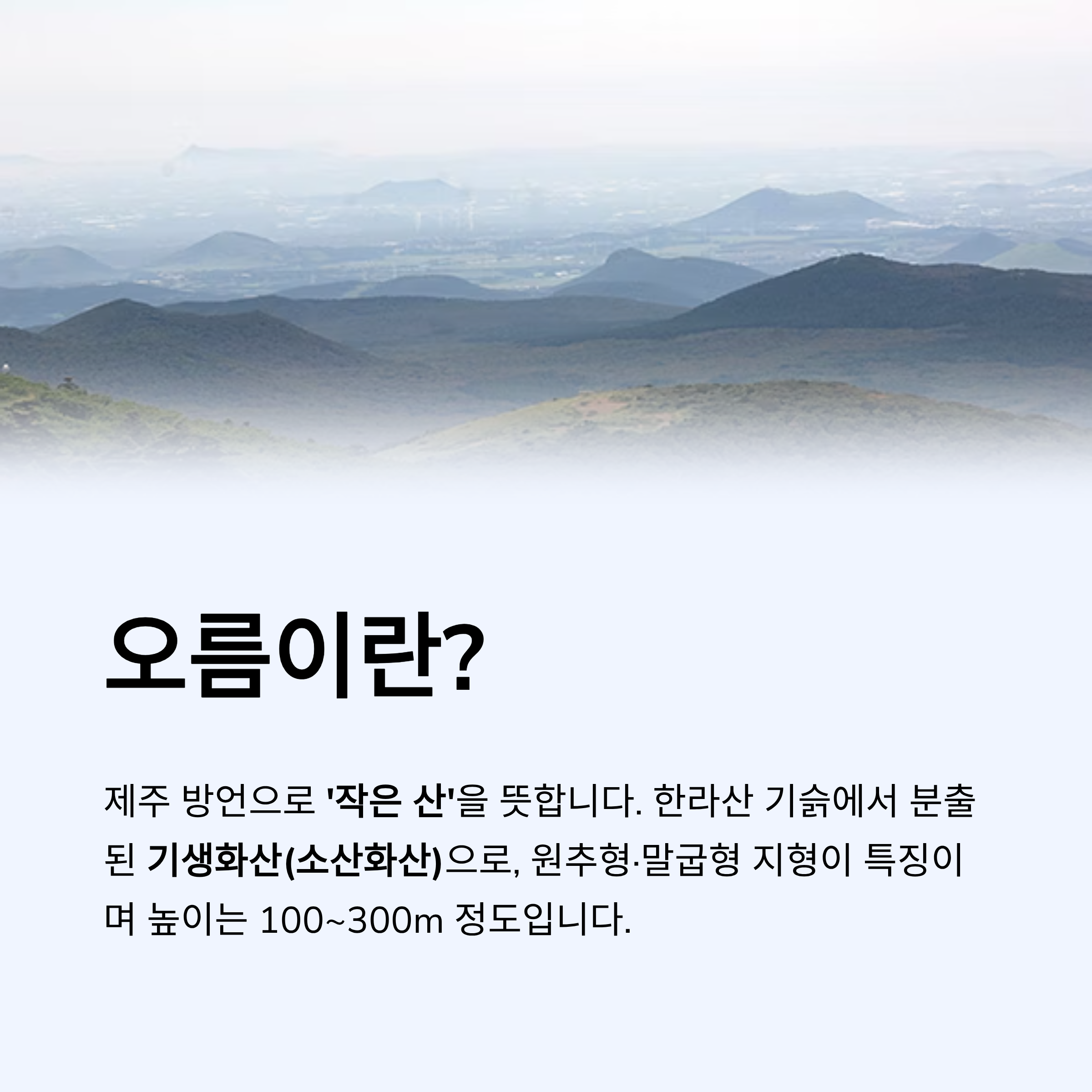 지질학적으로는 한라산 기슭에서 분출된 "기생화산(소산화산)"을 말합니다. 분화구와 화산쇄설물로 구성된 원추형·말굽형 지형이 특징이며, 높이는 대체로 100~300m 정도입니다.