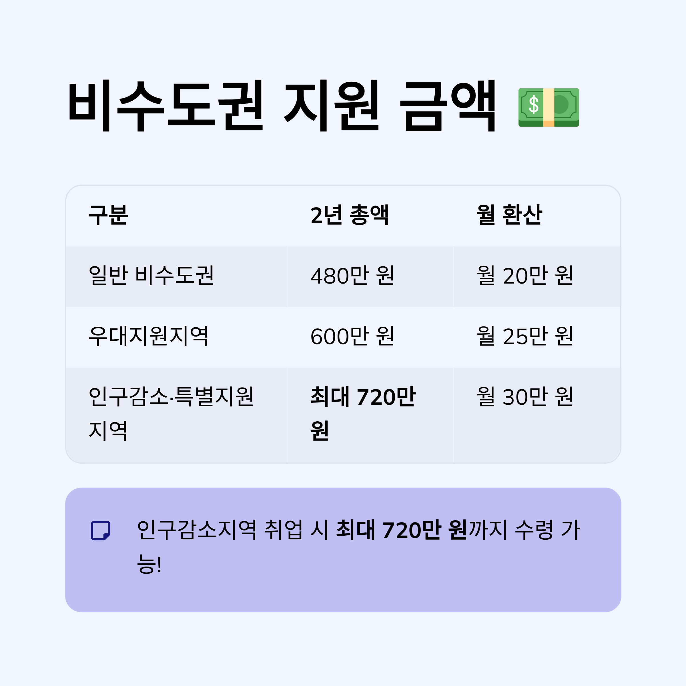 | 인구감소·특별지원지역 | 최대 720만 원 | 월 30만 원 |