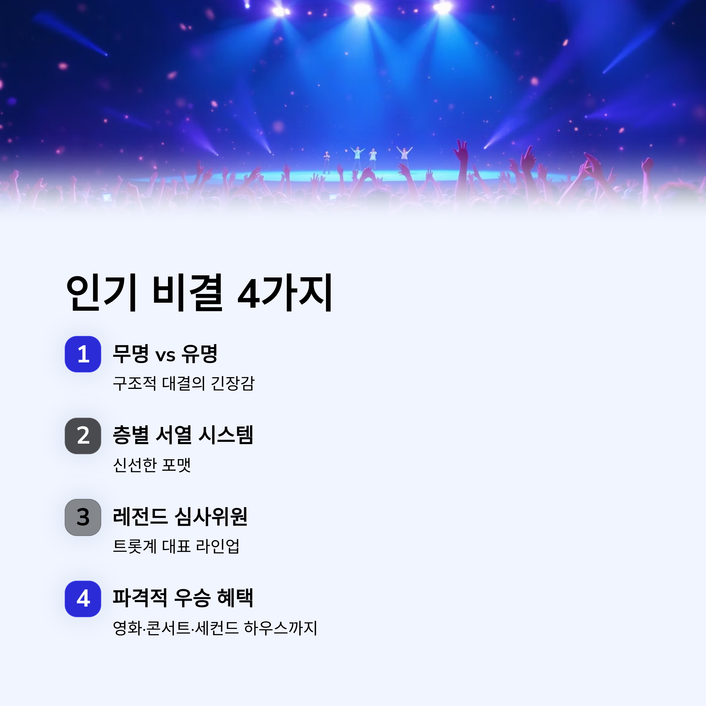 기존 트롯 오디션과 차별화된 ‘계급 서열 구조’가 시청자 몰입도를 크게 높이고 있습니다.