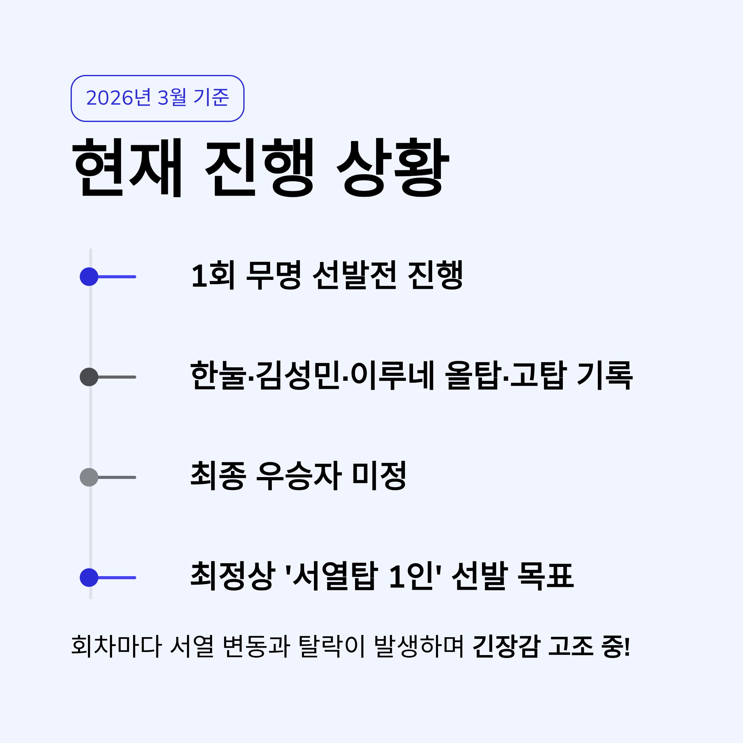 회차가 거듭될수록 서열 변동과 탈락자가 발생하며 긴장감이 고조되고 있습니다.