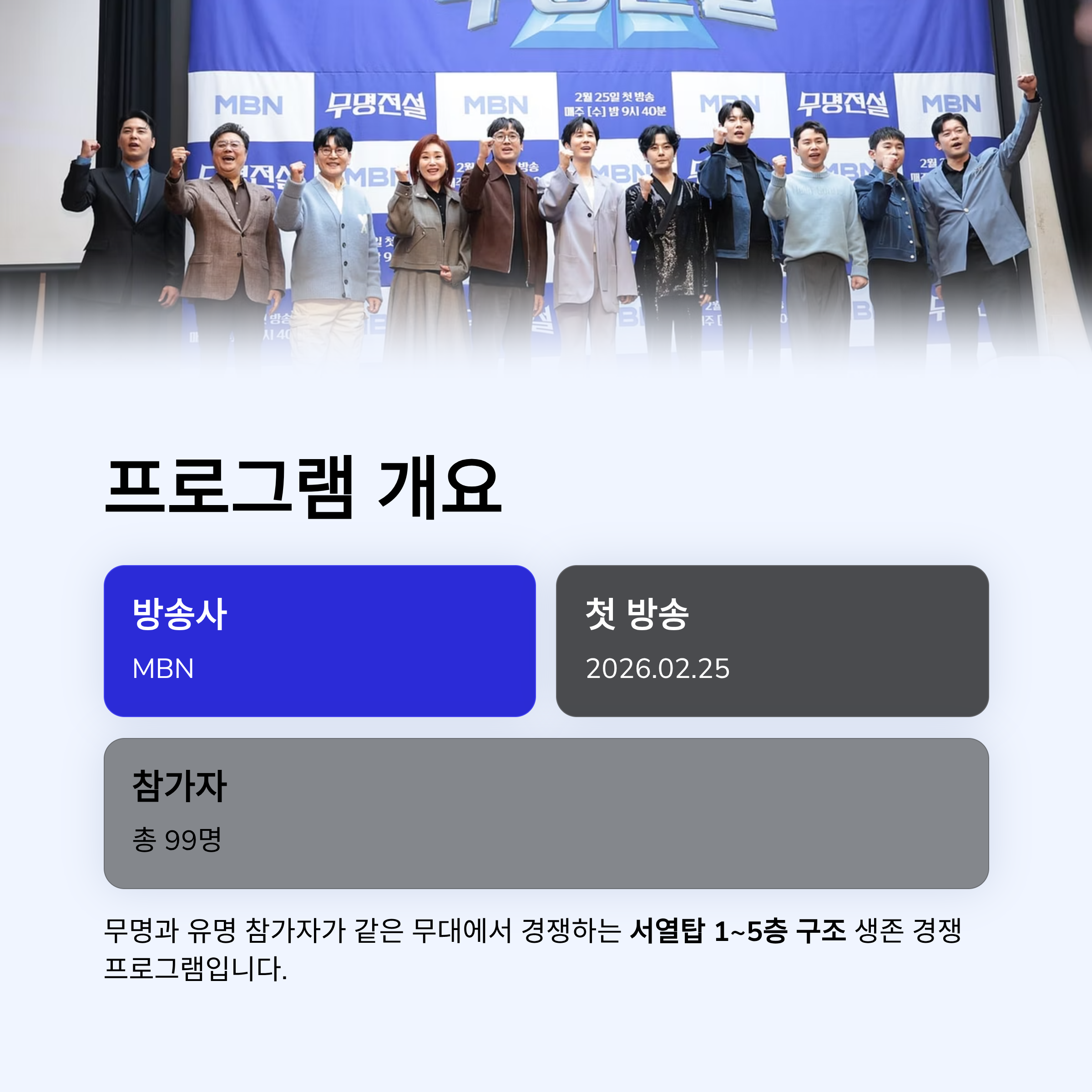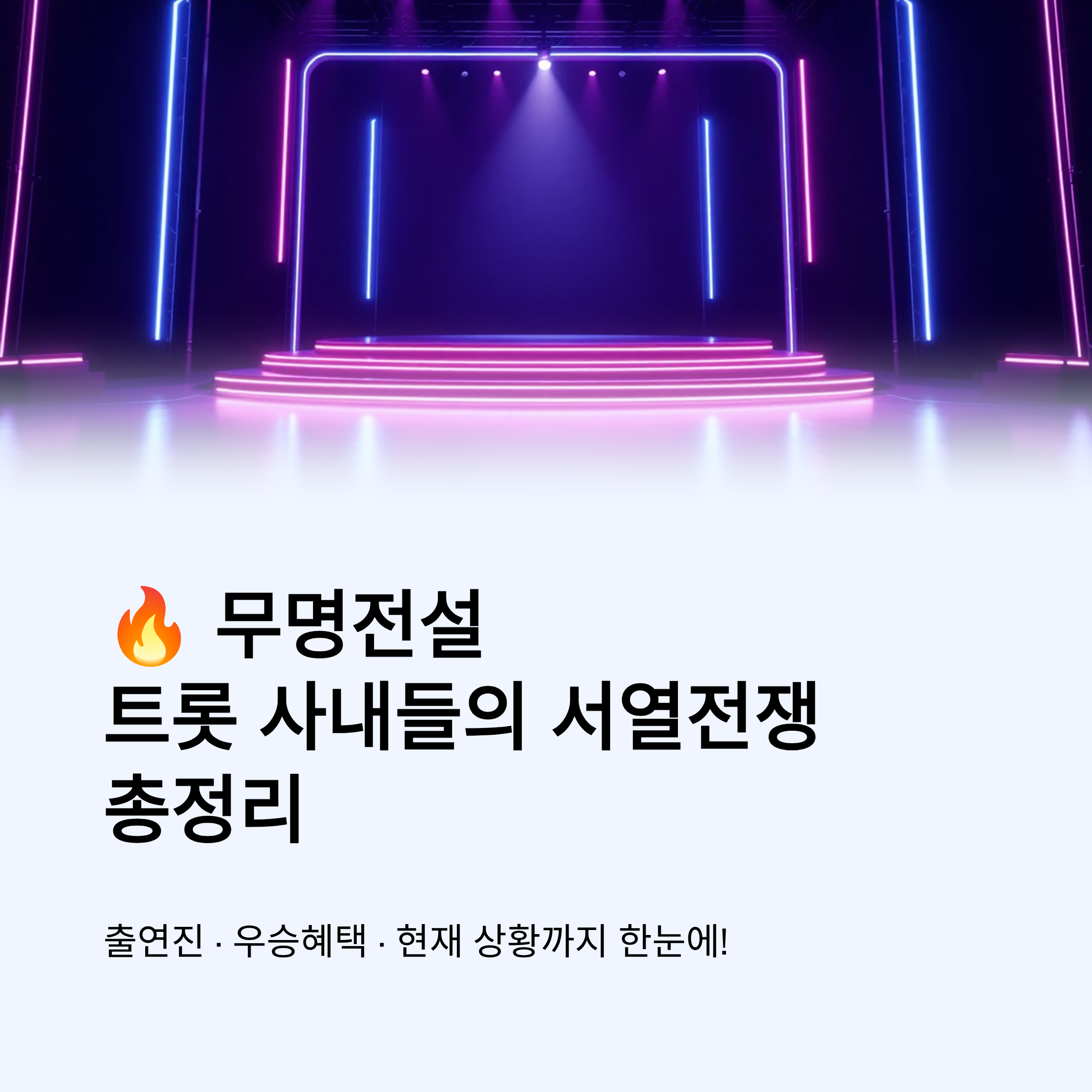 2026년 가장 화제가 되고 있는 남자 트롯 오디션 프로그램이 바로 ‘무명전설-트롯 사내들의 서열전쟁’입니다. 기존 트롯 오디션과 달리 ‘층별 서열 시스템’이라는 파격적인 포맷을 도입해 방송 직후부터 큰 반향을 일으켰습니다.