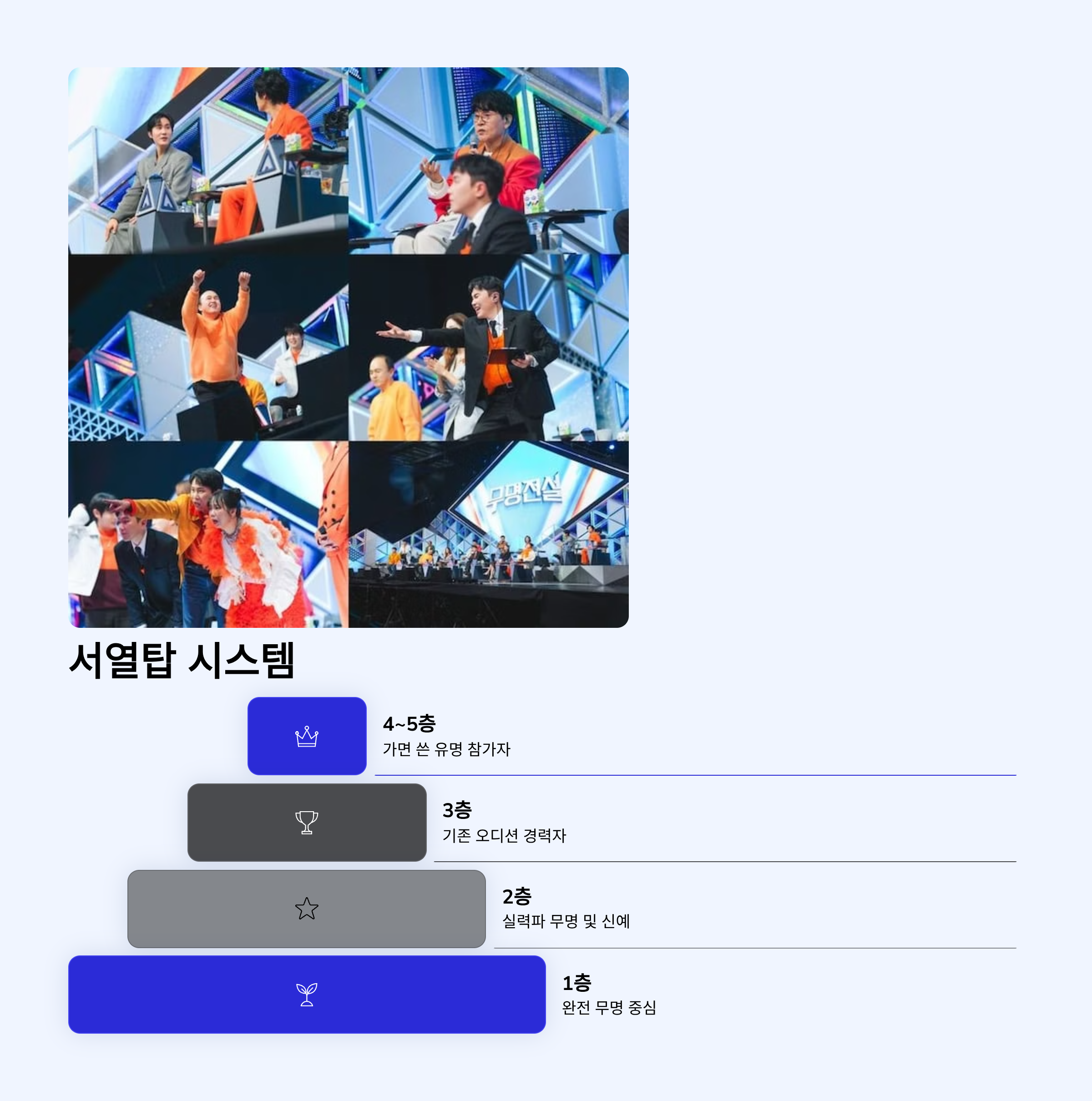 ‘서열전쟁’이라는 제목처럼 참가자들은 인지도와 실력에 따라 층이 나뉩니다.